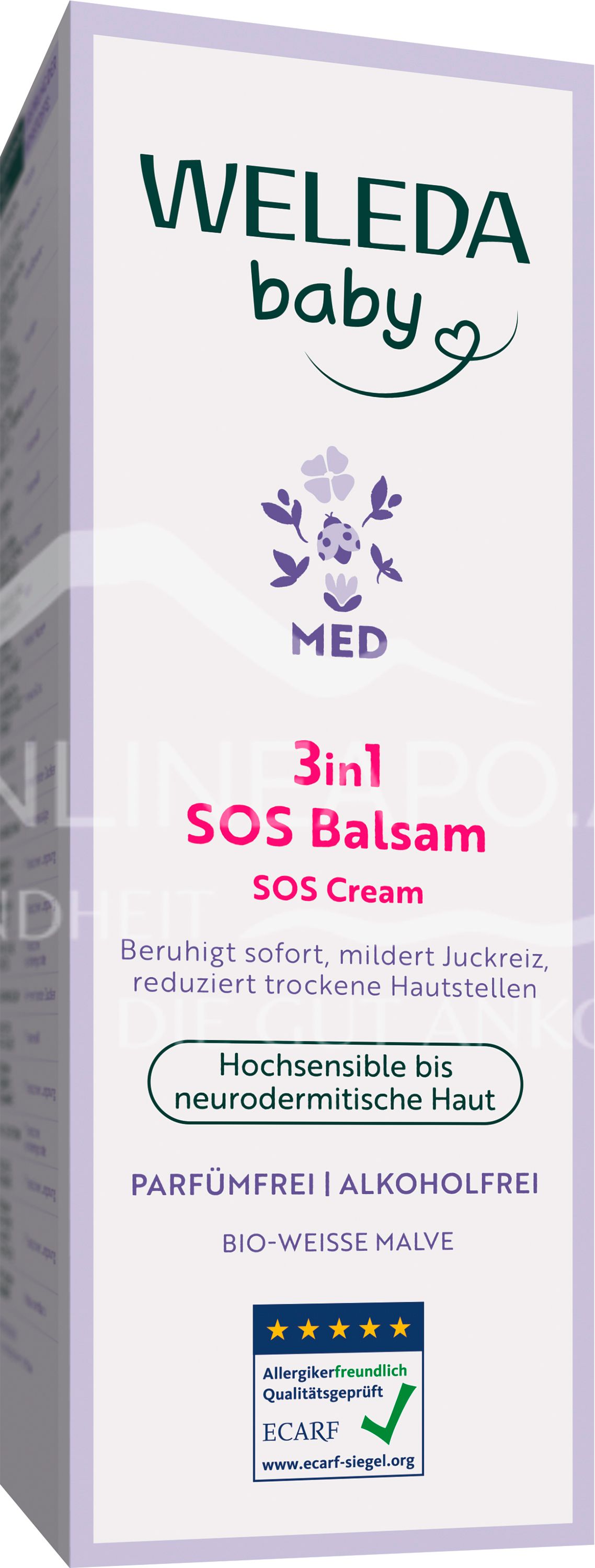 Der Weleda Baby MED 3 in 1 SOS Balsam mit Bio-Weißer Malve beruhigt hochsensible und neurodermitische Babyhaut sofort. Er lindert Juckreiz direkt nach der ersten Anwendung, mindert Rötungen und stärkt die Hautbarriere.