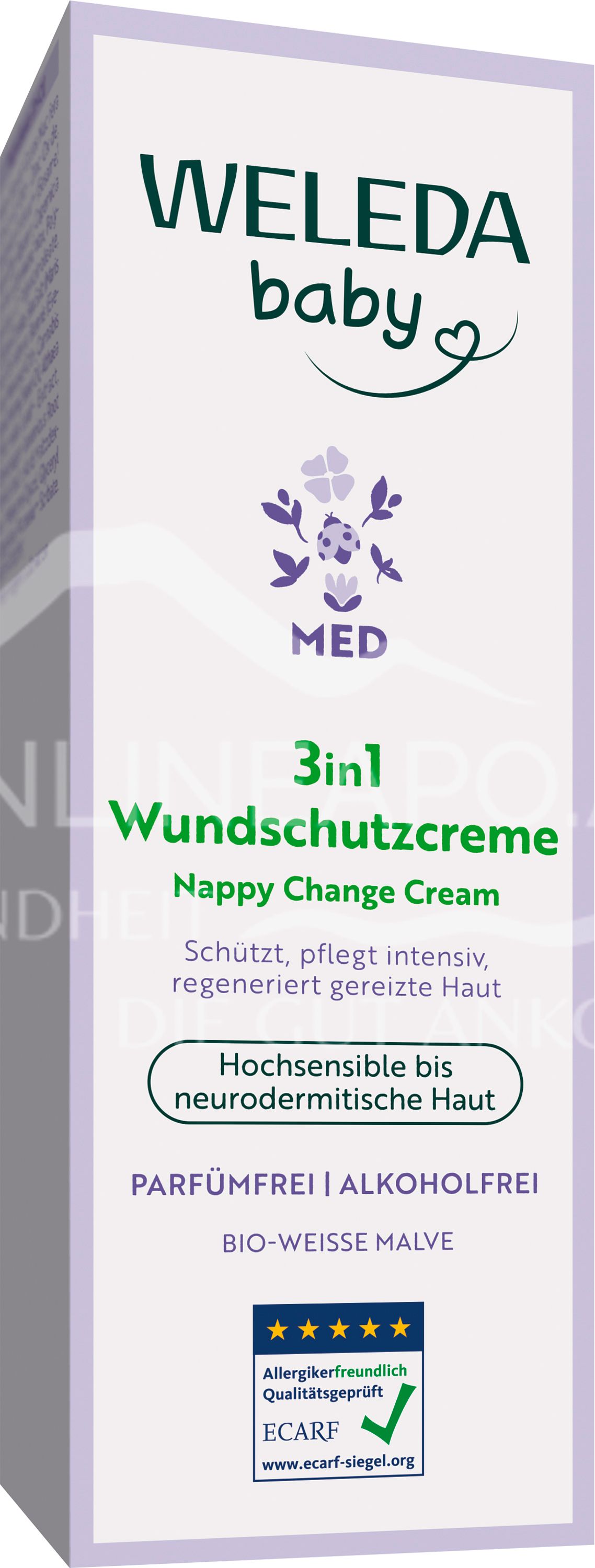 Die Med 3in1 Wundschutzcreme Weisse Malve von Weleda Baby beruhigt die Haut im Windelbereich, schützt wirksam vor Wundsein und mindert Rötungen.