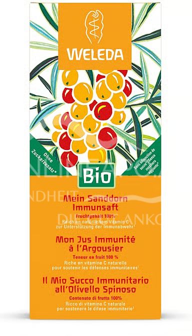 Unterstützen Sie Ihre Widerstandskraft mit dem köstlichen Sanddorn Immunsaft von Weleda. Reich an Vitamin C und wertvollen Pflanzenstoffen. Ideal für die ganze Familie!