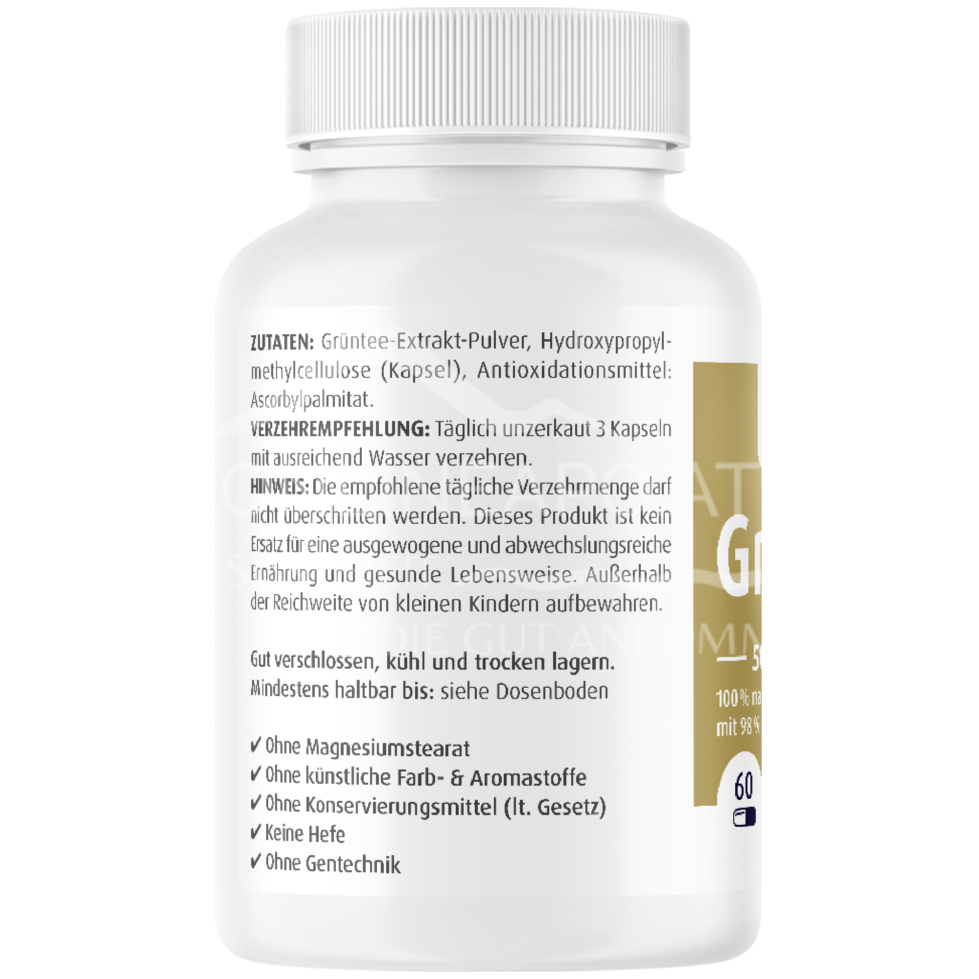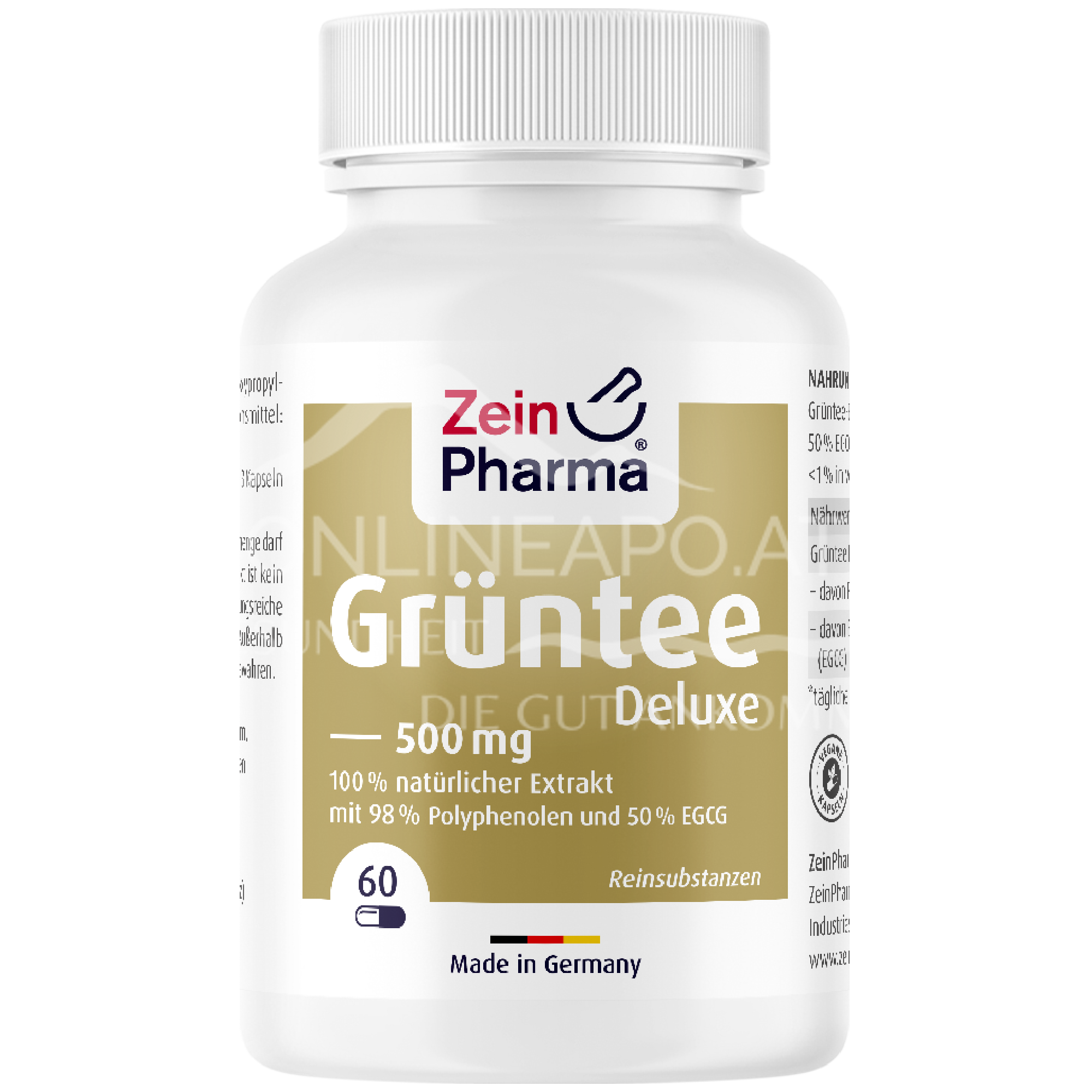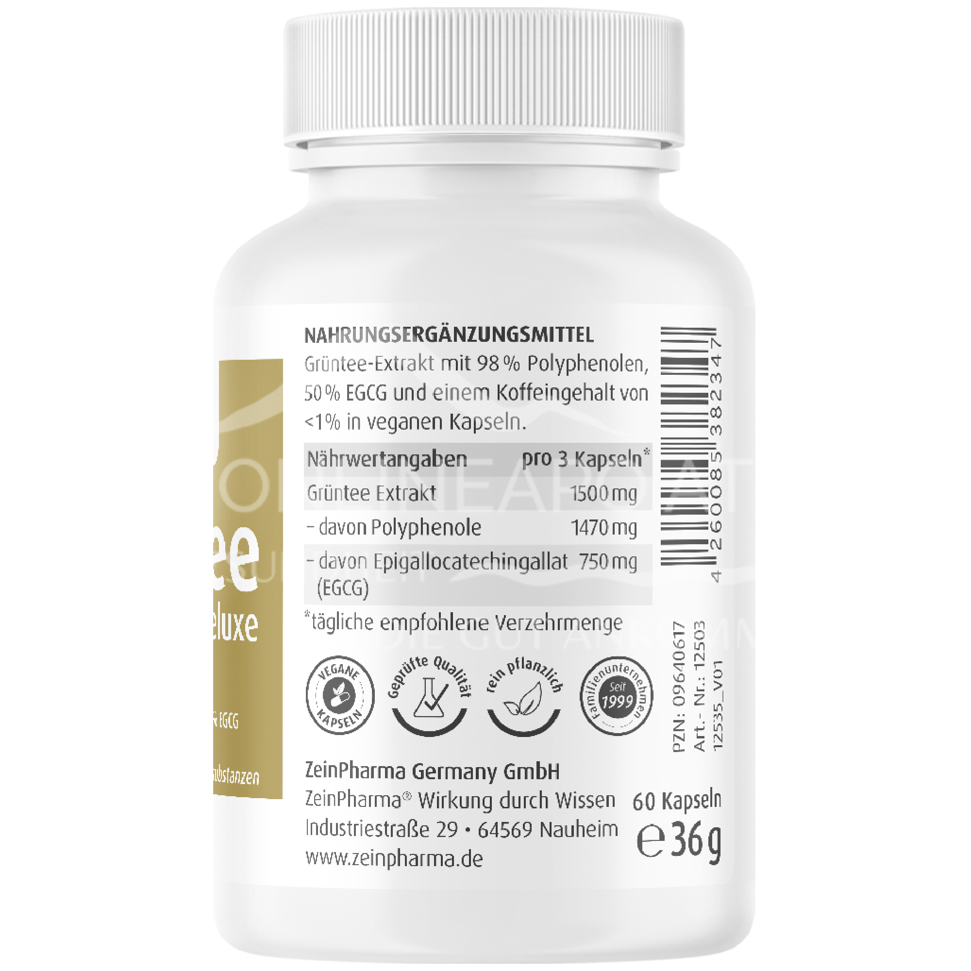 Die ZeinPharma Grüntee Deluxe 500 mg Kapseln sind ein Nahrungsergänzungsmittel mit natürlichem Blattextrakt aus Grüntee (Camellia sinensis), auf 98 % Polyphenole (UV-geprüft) und 50 % EGCG (HPLC-geprüft) standardisiert, mit weniger als 1 % Koffein.