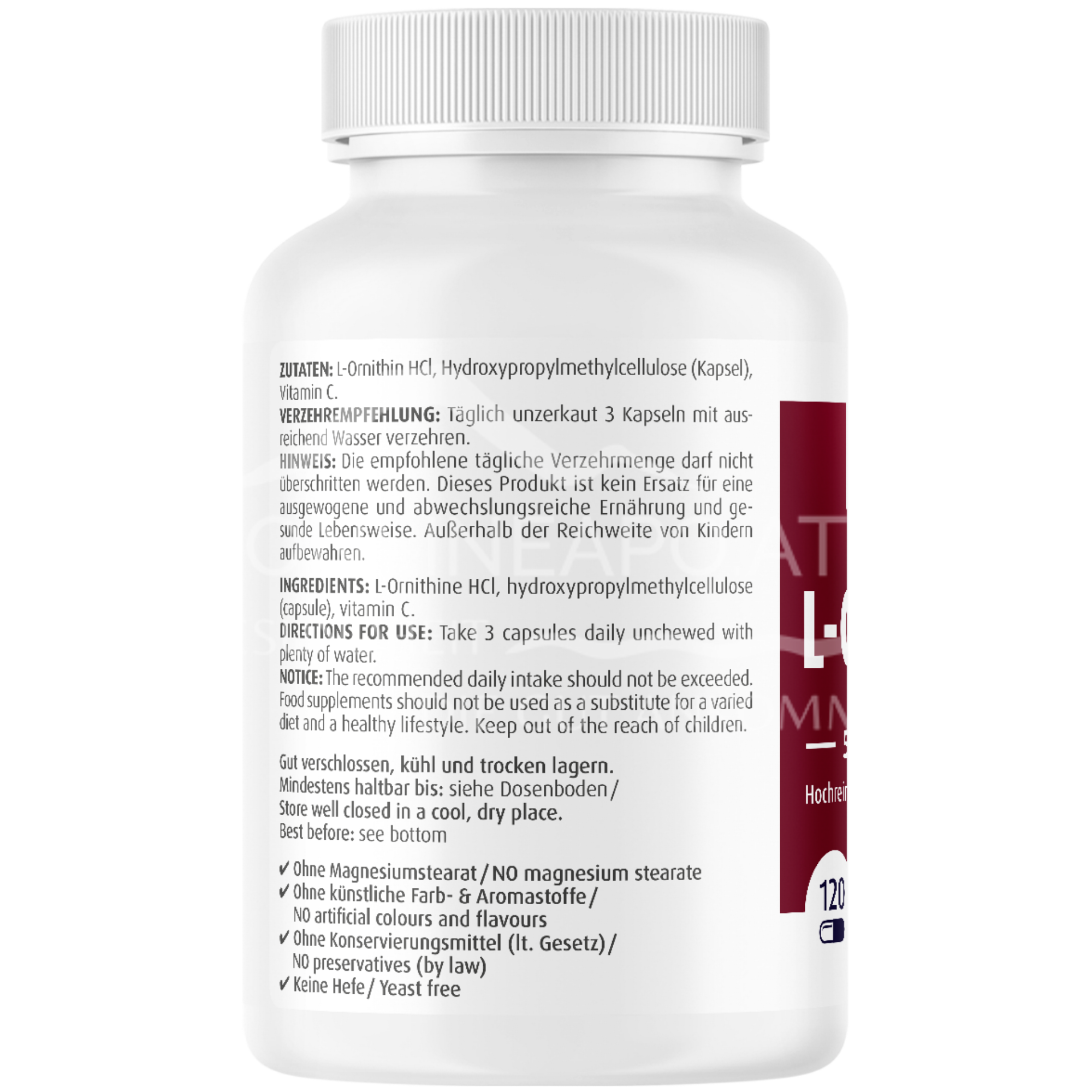 - Zutaten: L-Ornithin HCl (80,6 %; Ornithin), Kapselhülle: Hydroxypropylmethylcellulose (HPMC).