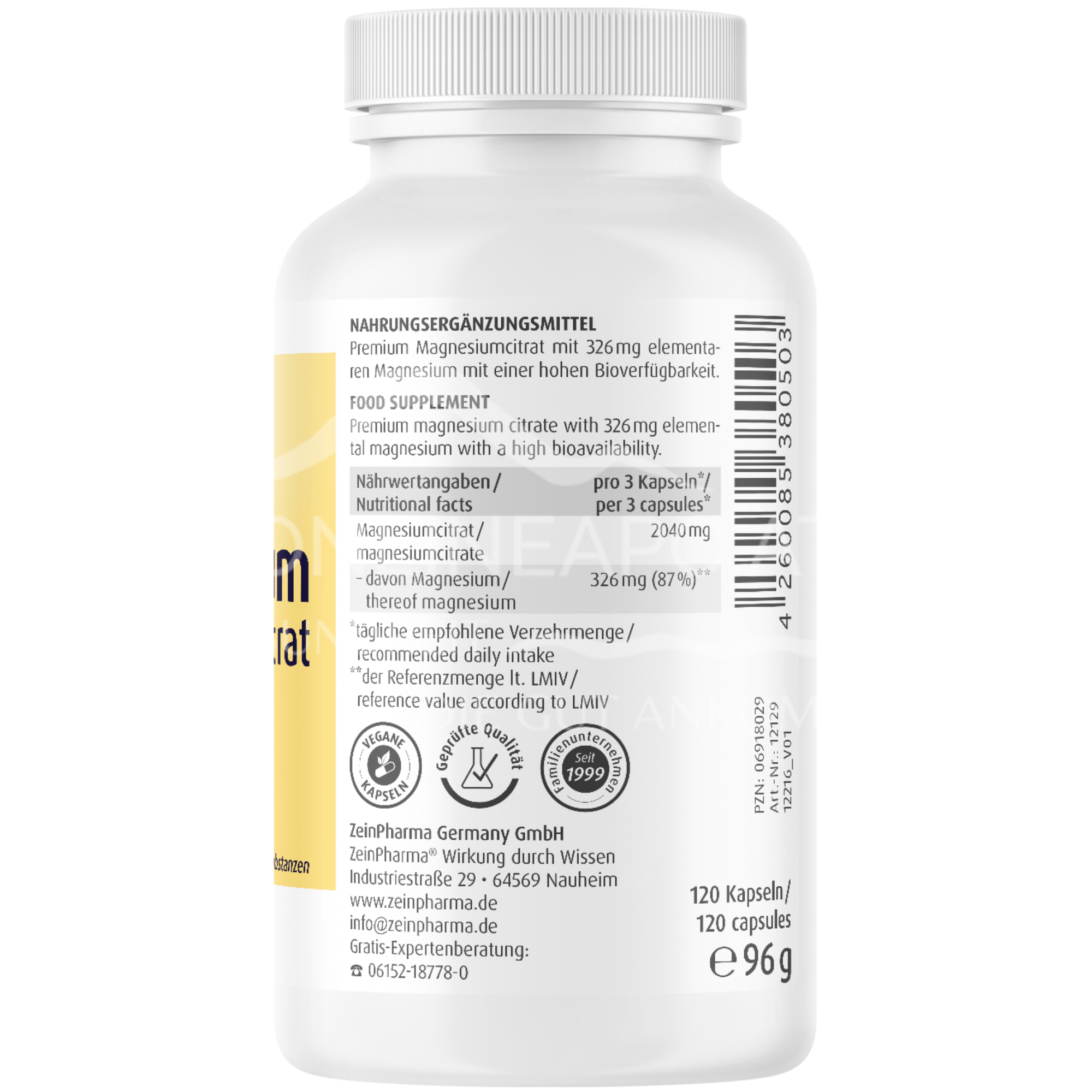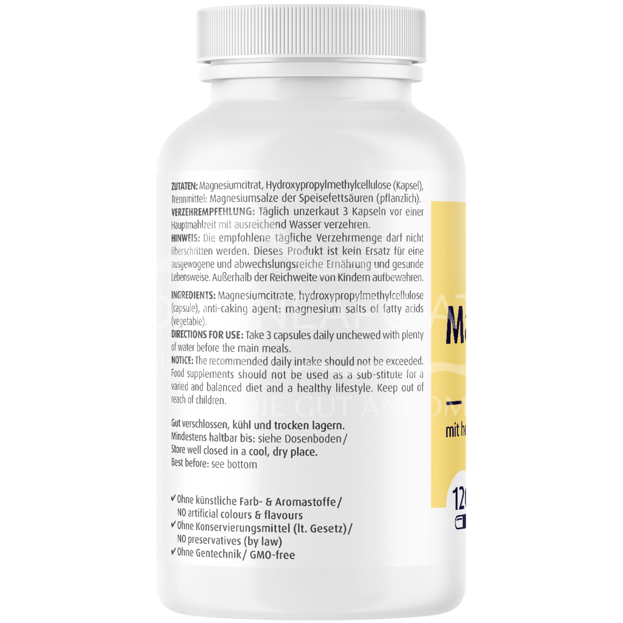 - Zutaten: Trimagnesiumdicitrat, Hydroxypropylmethylcellulose (Kapsel), Antioxidationsmittel: Ascorbylpalmitat.