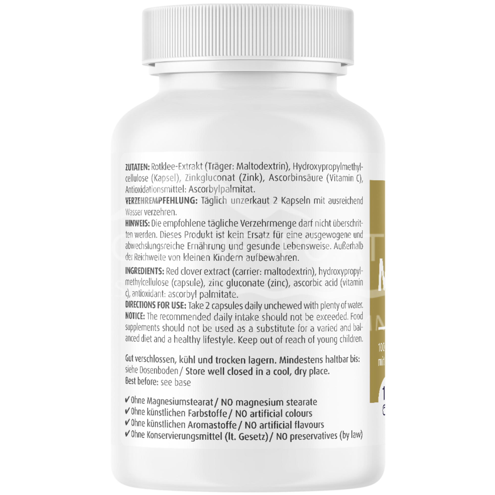 - Zutaten: Rotklee-Extrakt (Träger: Maltodextrin), Hydroxypropylmethylcellulose (Kapsel), Zinkgluconat (Zink), Ascorbinsäure (Vitamin C), Antioxidationsmittel: Ascorbylpalmitat.