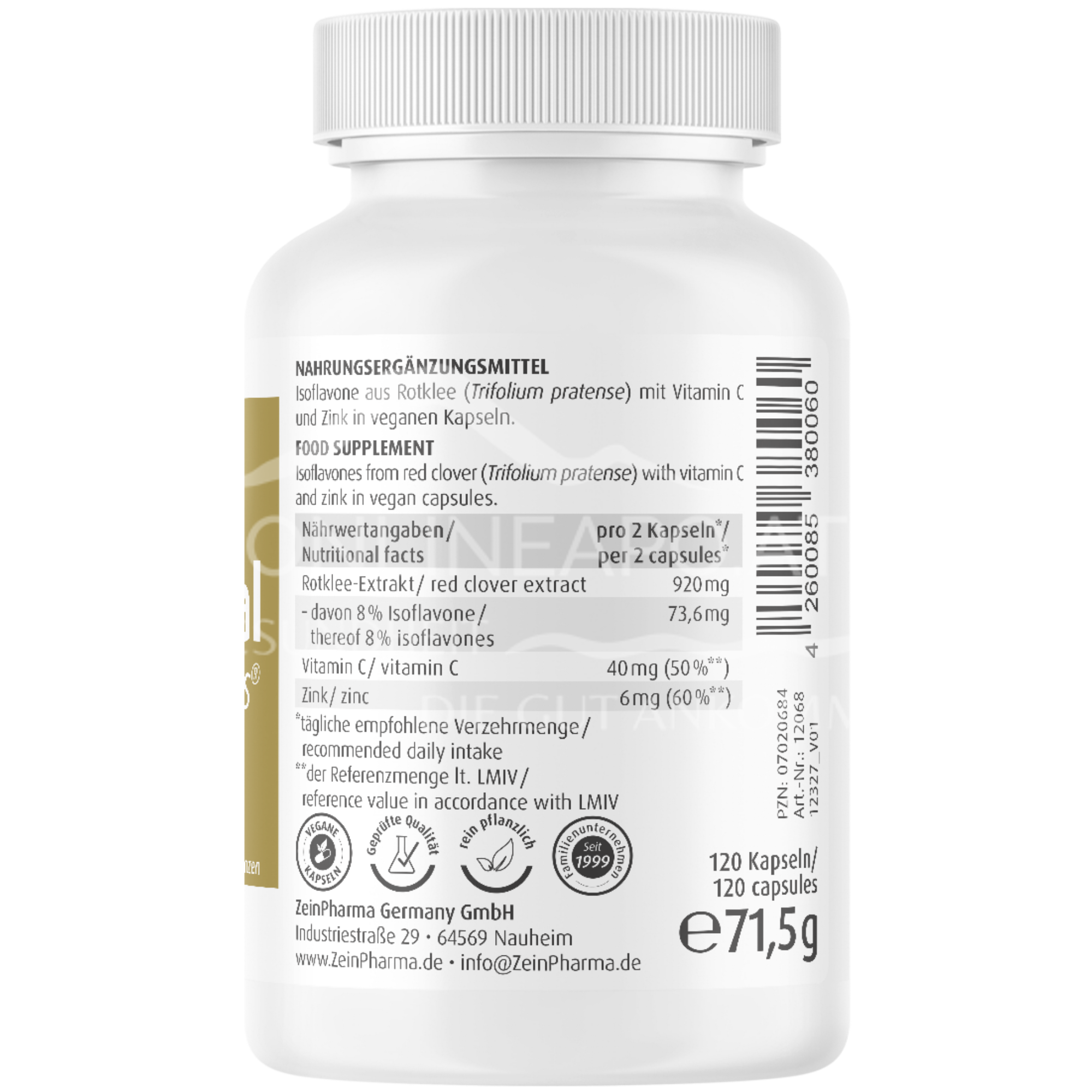 - Nährwertangaben pro 2 Kapseln*: Rotklee-Extrakt 920 mg - davon 8 % Isoflavone 73,6 mg, Vitamin C 42,5 mg (53 %**), Zink 6 mg (60 %**). * tägliche empfohlene Verzehrmenge. ** der Referenzmenge lt. LMIV.