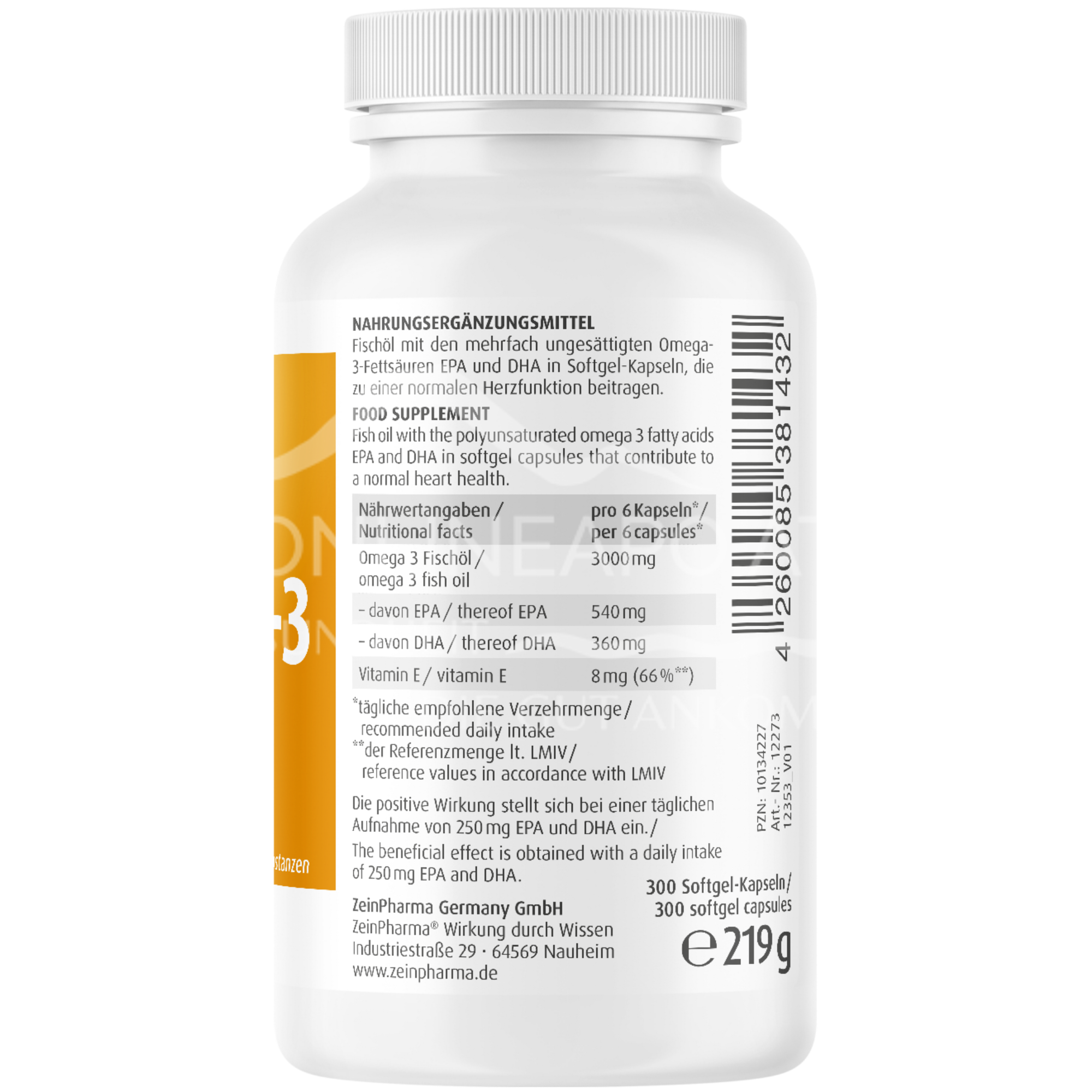 - Zusammensetzung pro Tagesdosis (6 Kapseln): Omega 3 Fischöl 3000 mg - davon Eicosapentaensäure (EPA) 540 mg - davon Docosahexaensäure (DHA) 360 mg.