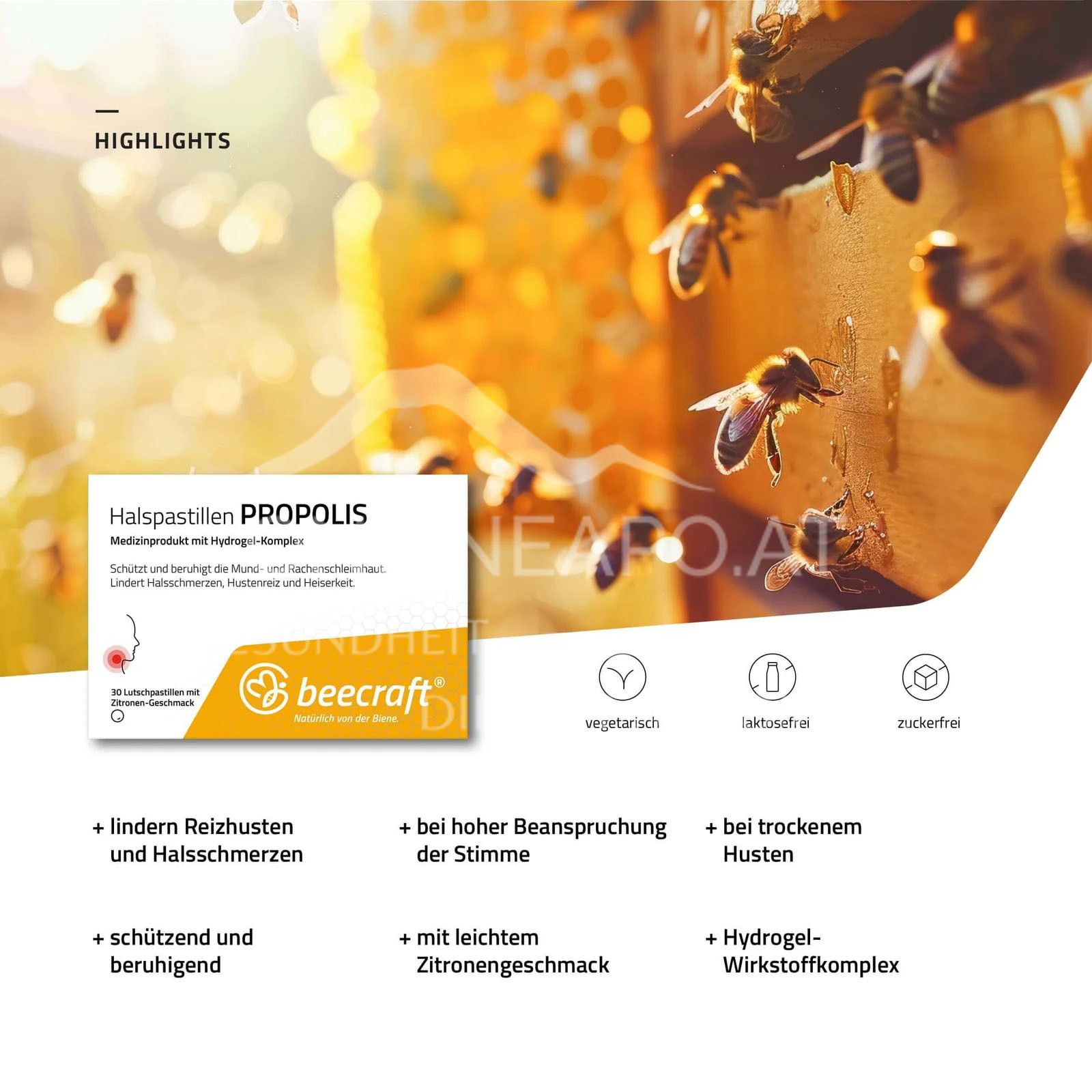 beecraft® Halspastillen Propolis sind ein Medizinprodukt mit Hydrogel-Komplex. Schützt und beruhigt die Mund- und Rachenschleimhaut. Lindern Halsschmerzen, Hustenreiz und Heiserkeit.