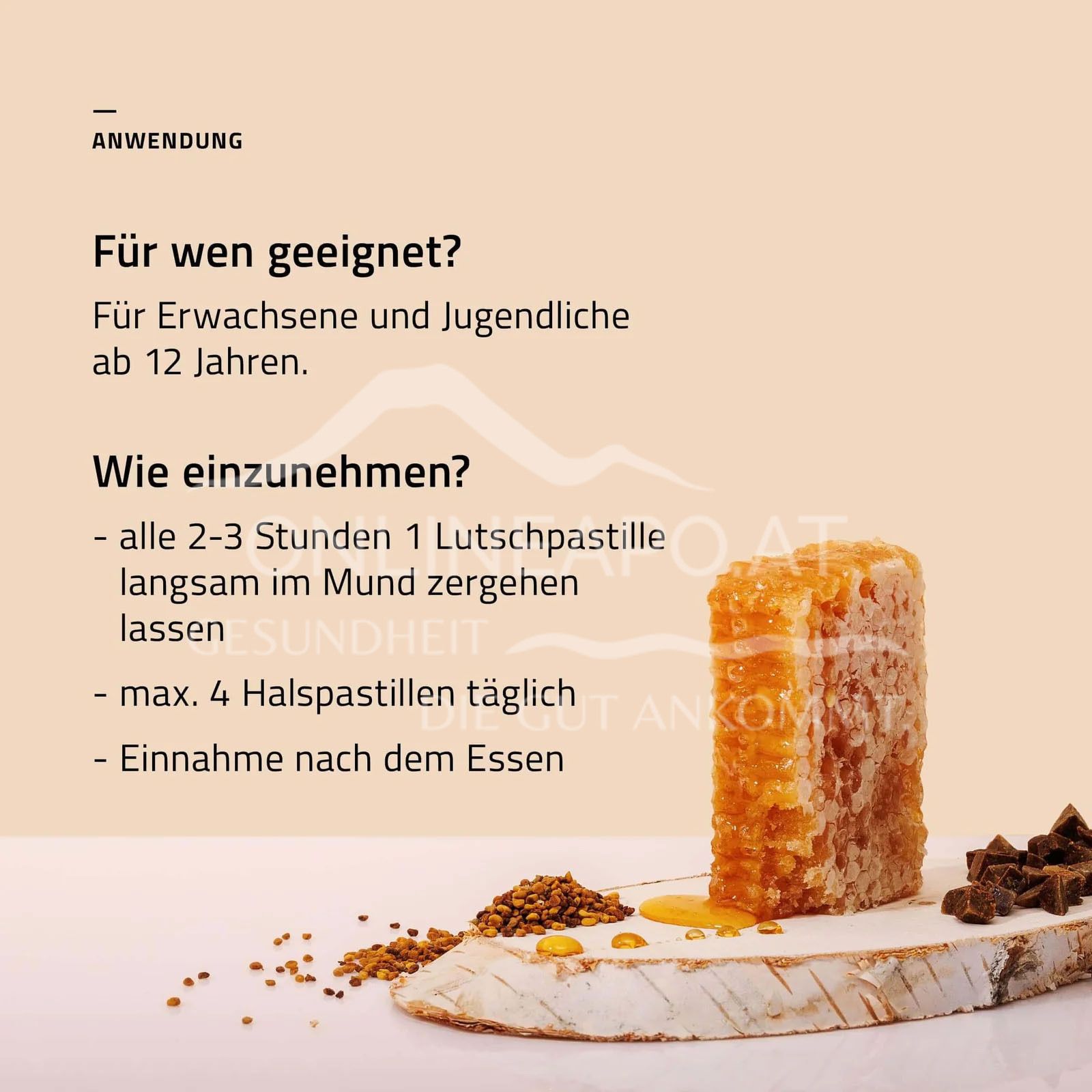 - Erwachsene und Jugendliche ab 12 Jahren lassen je nach Bedarf alle 2-3 Stunden 1 Lutschpastille langsam im Mund zergehen. Die Tagesdosis sollte 4 Lutschpastillen nicht überschreiten. Pastille nicht schlucken oder zerkauen. Empfohlen wird die Einnahme nach dem Essen.
