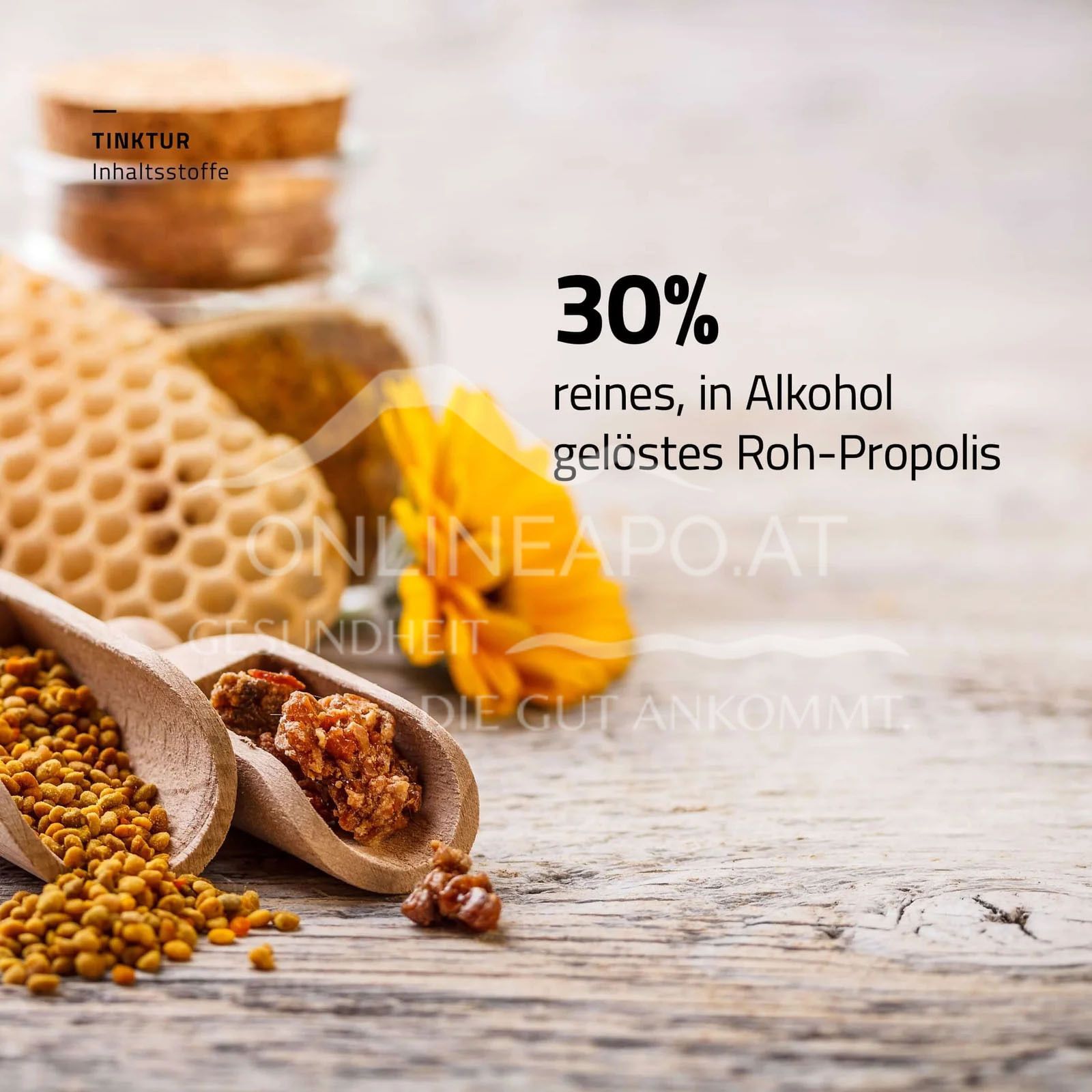 Zutaten: Alcohol, Propolis-Extrakt, Aqua.