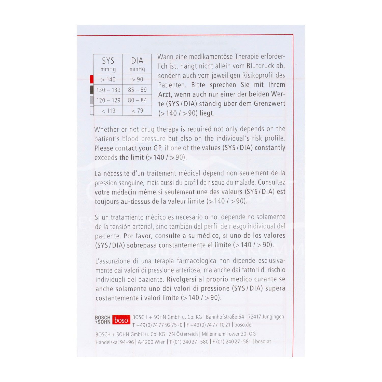 Bitte sprechen Sie mit Ihrem Arzt, wenn auch nur einer der beiden Werte (SYS / DIA) ständig über dem Grenzwert (> 140 / > 90) liegt.