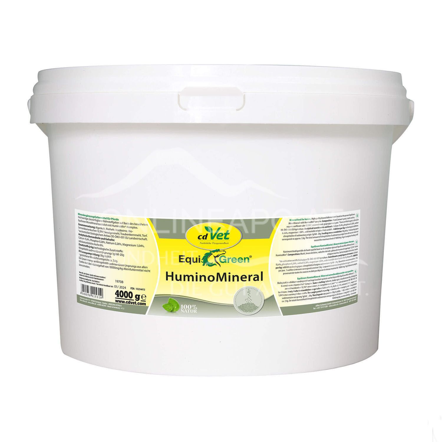 EquiGreen HuminoMineral besteht aus dem einzigartigen HuminoMin-Komplex® und natürlichen Nährstoffen. Es ist reich an essentiellen Aminosäuren, Vitaminen, Mineralstoffen und Spurenelementen. Hervorzuheben ist ganz besonders sein hoher Gehalt an Zink und Magnesium. Des Weiteren enthält EquiGreen HuminoMineral viel Folsäure sowie Vitamin E, B-Vitamine, ß-Karotin, Schwefel, Kalium und Selen.