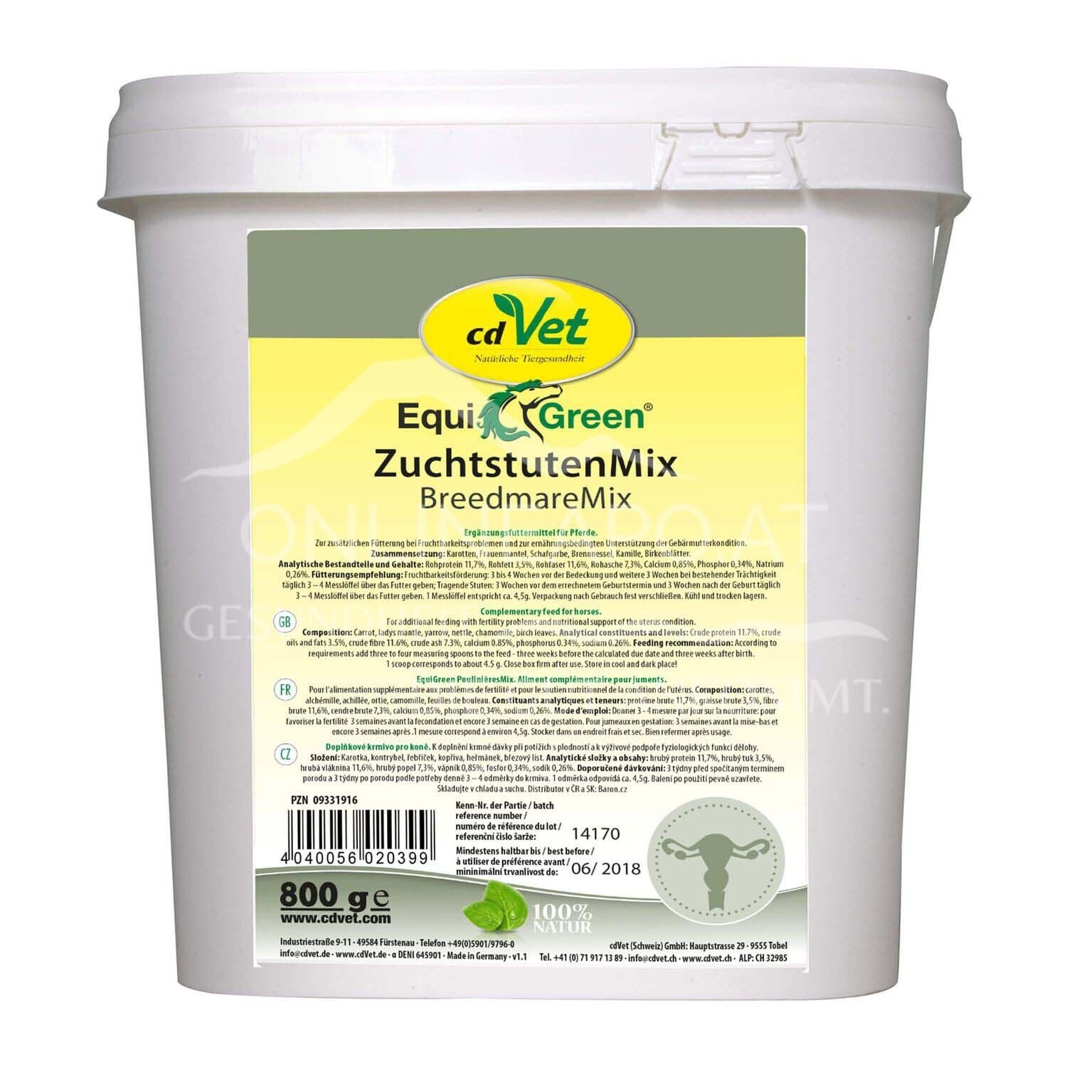 Der cdVet EquiGreen ZuchtstutenMix ist ein Ergänzungsfuttermittel (Pulver, grobe Struktur) für Pferde. Zur zusätzlichen Versorgung mit wichtigen Nährstoffen bei Fruchtbarkeitsproblemen, sowie zur ernährungsbedingten Unterstützung der Gebärmutterkondition.