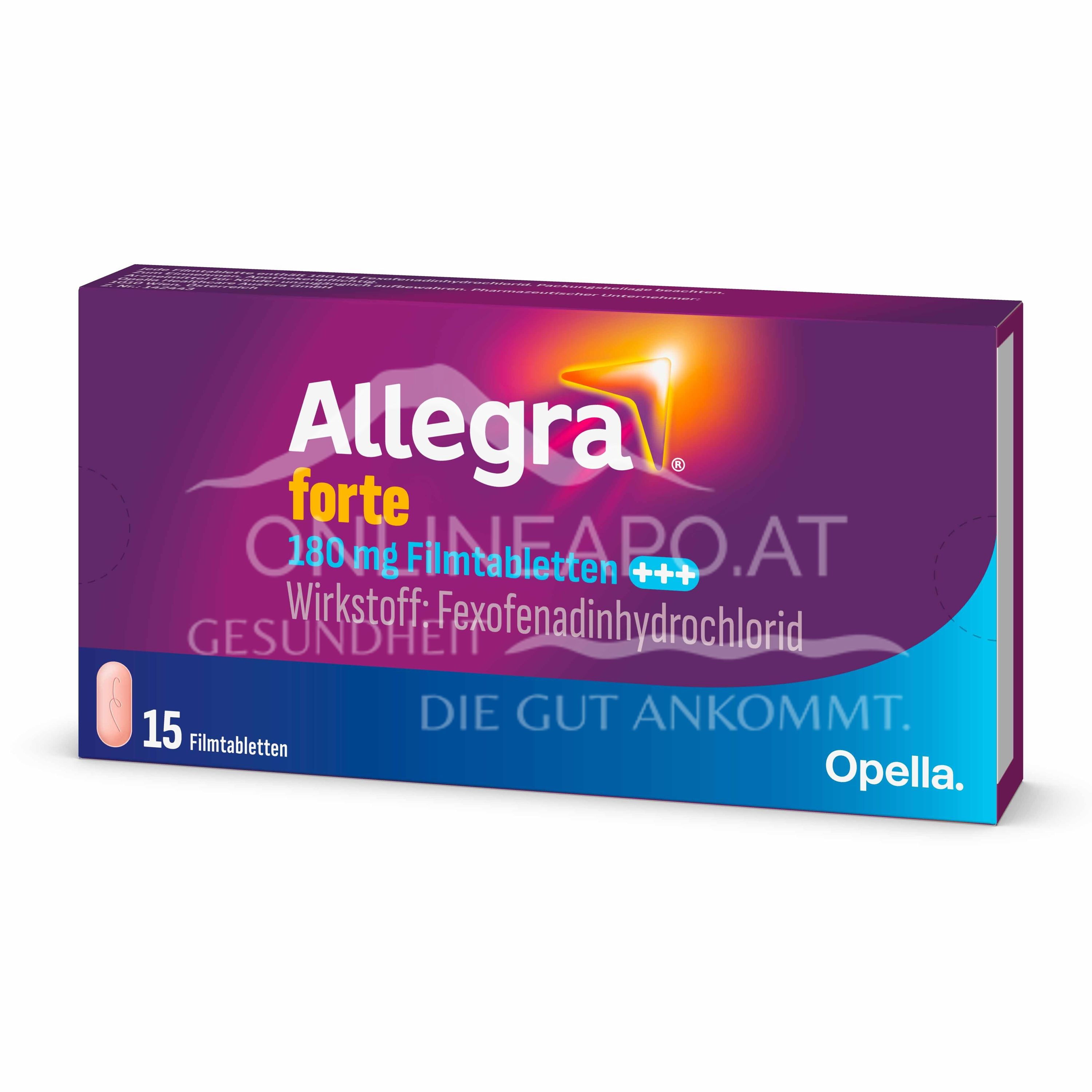 Die Allegra® forte 180 mg Filmtabletten sind ein rezeptfreies Arzneimittel mit dem Wirkstoff: Fexofenadinhydrochlorid. Das Antihistaminikum wird zur Linderung der Symptome von allergischen Hautreaktionen wie Jucken, Schwellung und Ausschlag angewendet.