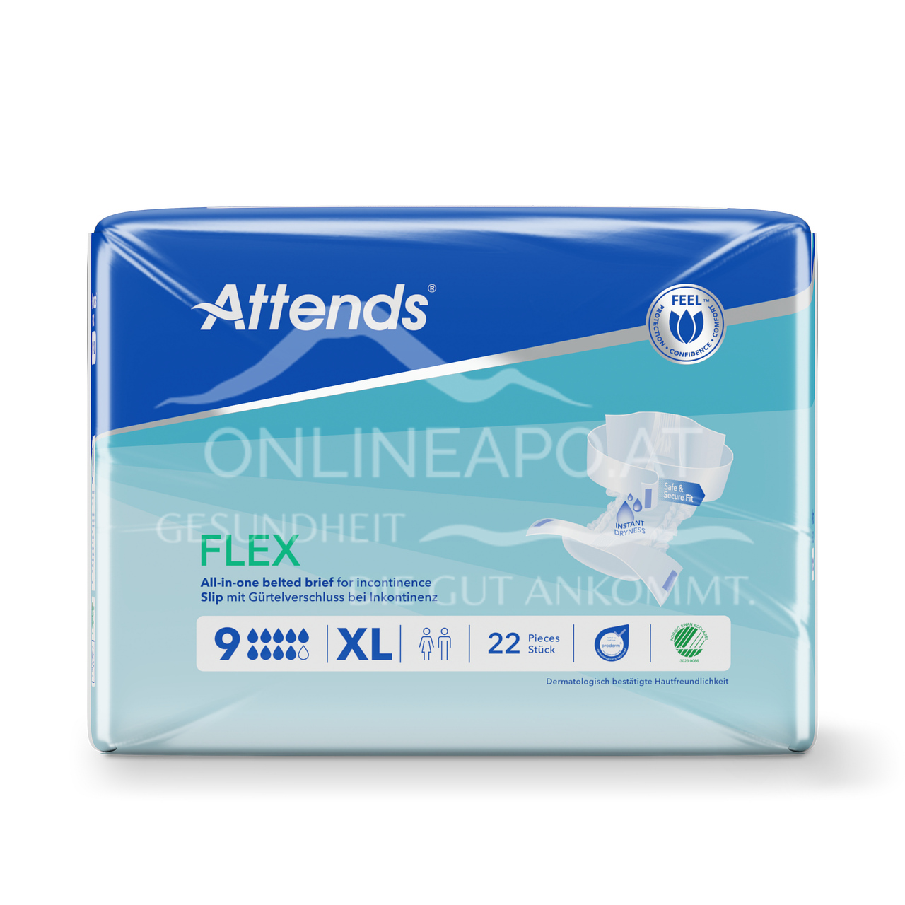 The Attends Flex 9 XL with practical belt system makes it easy to put on while standing or lying down. The breathable briefs offer maximum comfort and reliable leakage protection for severe bladder weakness. Ideal for more independence.