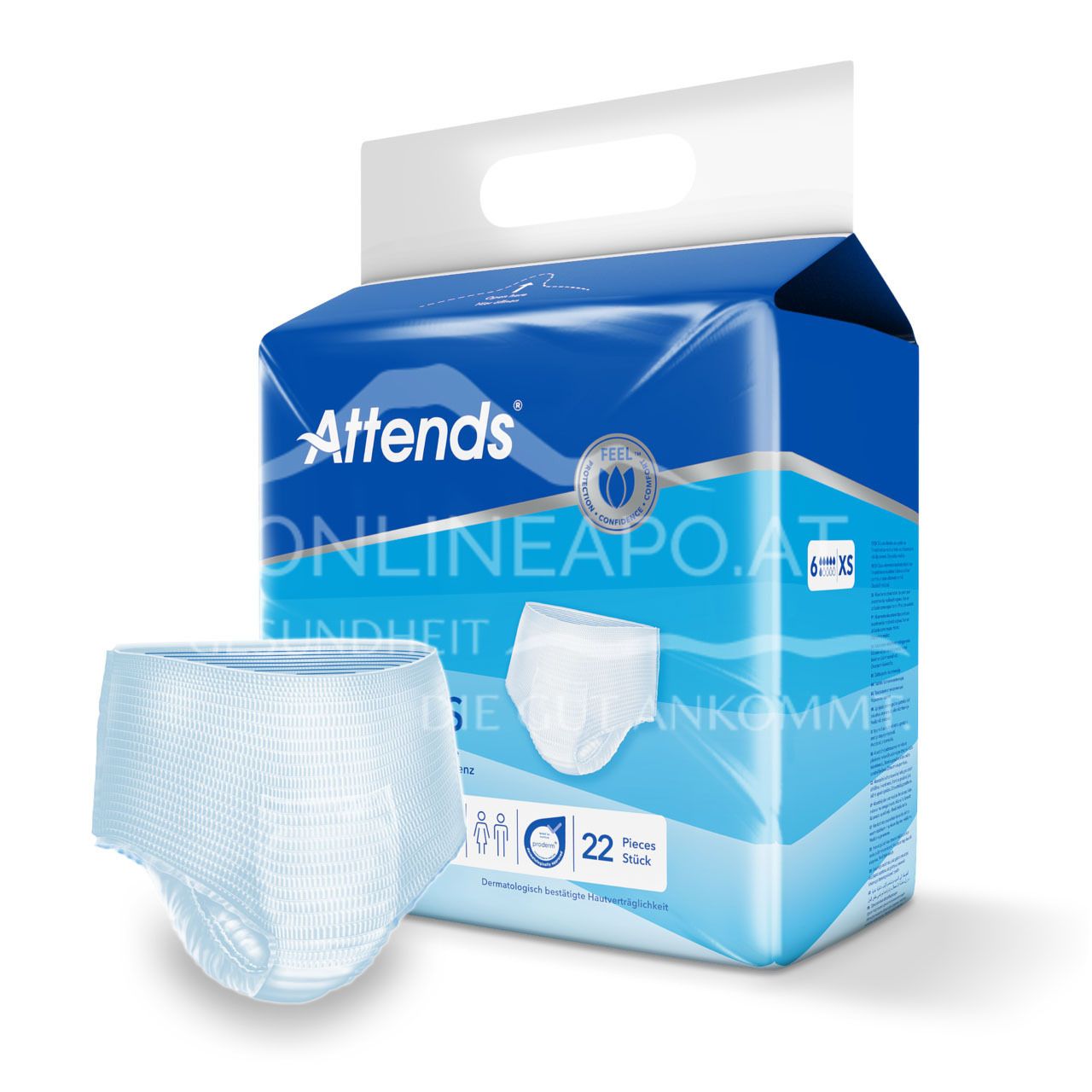 Attends Pull-Ons 6 XS offer discreet protection and maximum security for moderate urinary incontinence. The highly absorbent disposable underwear impresses with high wearing comfort, odour absorption and a perfect fit for an active everyday life.