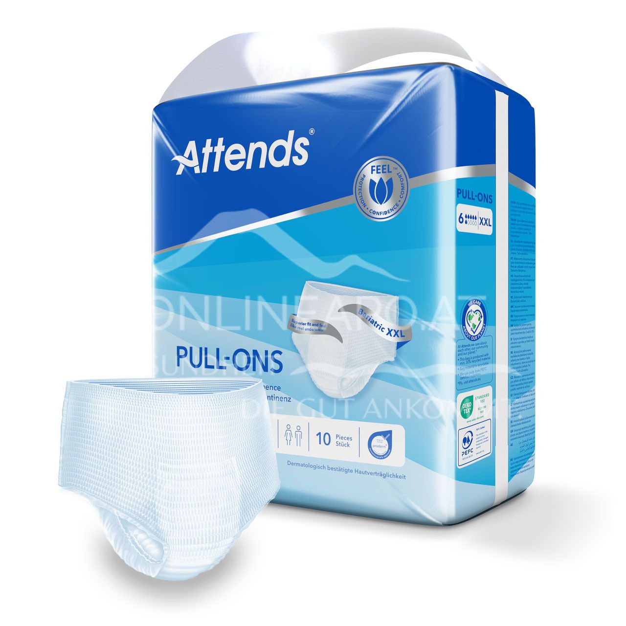 Attends Pull-Ons 6 are soft and discreet disposable trousers that feel like underwear. They are easy to put on and take off and are suitable for heavy incontinence. Attends Pull-Ons offer a superior fit for extra comfort. Their high-performance absorbent core protects against leakage and odour - for an active life and a secure feeling