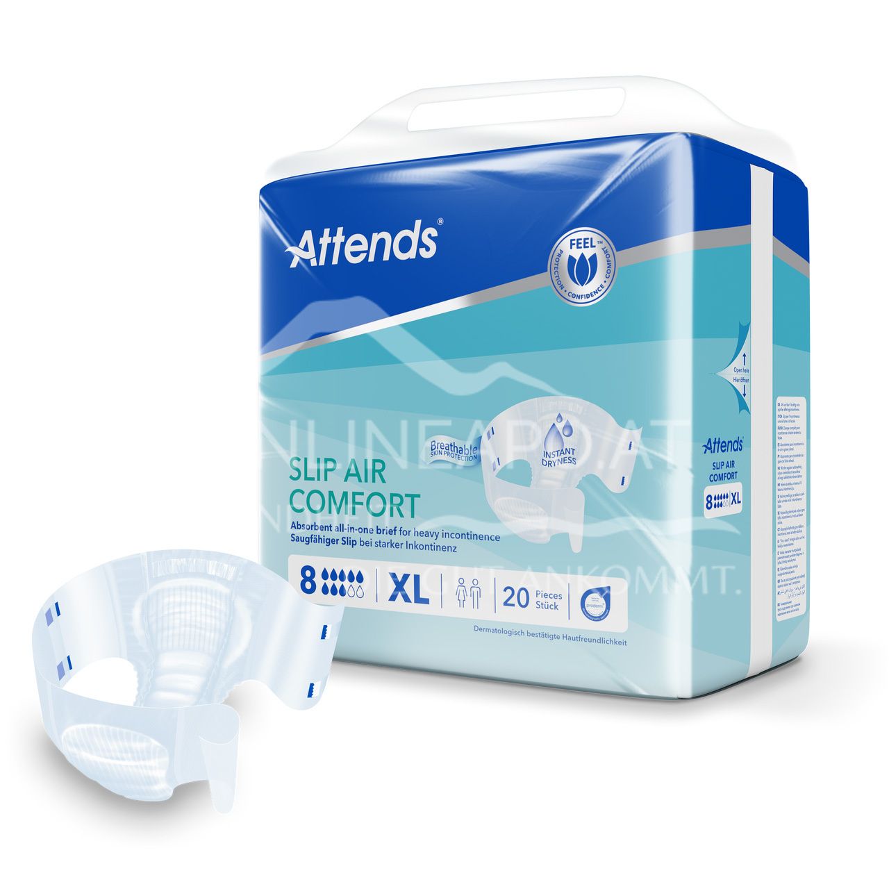 Attends Slip Air Comfort 8 Extra Large sind ein Sortiment von saugfähigen Slips für starke Harn- und/oder Stuhlinkontinenz mit speziellen Saugkanälen für schnelle Flüssigkeitsaufnahme und Trockenheit.