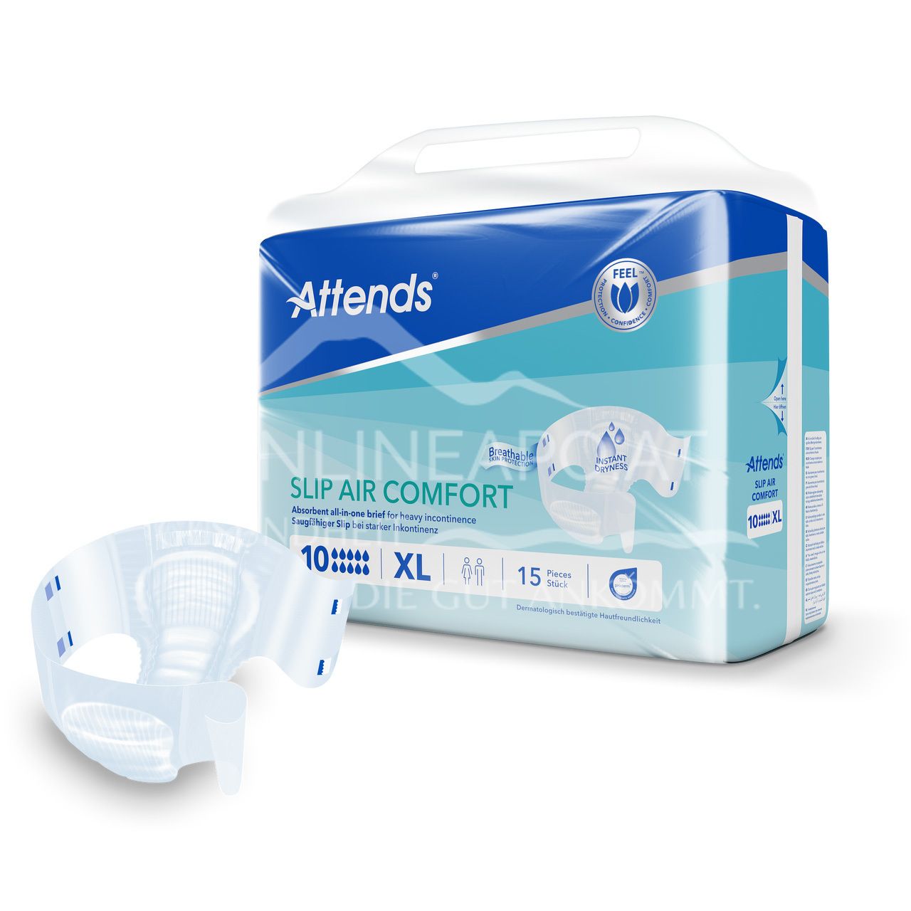 Attends Slip Air Comfort 10 Extra Large sind ein Sortiment von saugfähigen Slips für starke Harn- und/oder Stuhlinkontinenz mit speziellen Saugkanälen für schnelle Flüssigkeitsaufnahme und Trockenheit.