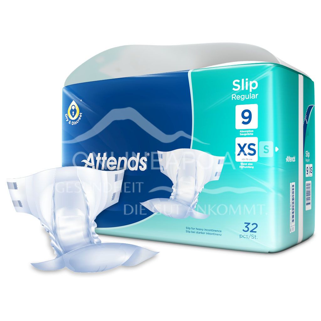 The Attends Slip Regular 9 XS are all-in-one products and offer reliable protection for severe urinary and/or faecal incontinence. Breathable, skin-friendly and discreet.