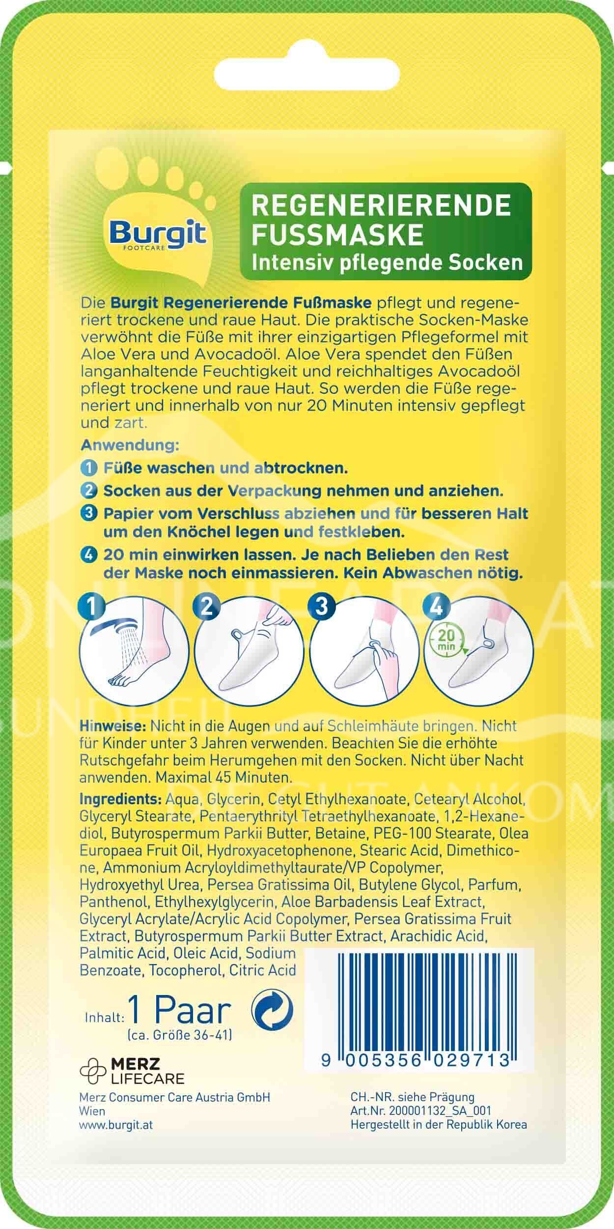 Die Burgit Regenerierende Fußmaske pflegt und regeneriert trockene und raue Haut. Die praktische Socken-Maske verwöhnt die Füße mit ihrer einzigartigen Pflegeformel mit Aloe Vera und Avocadoöl.