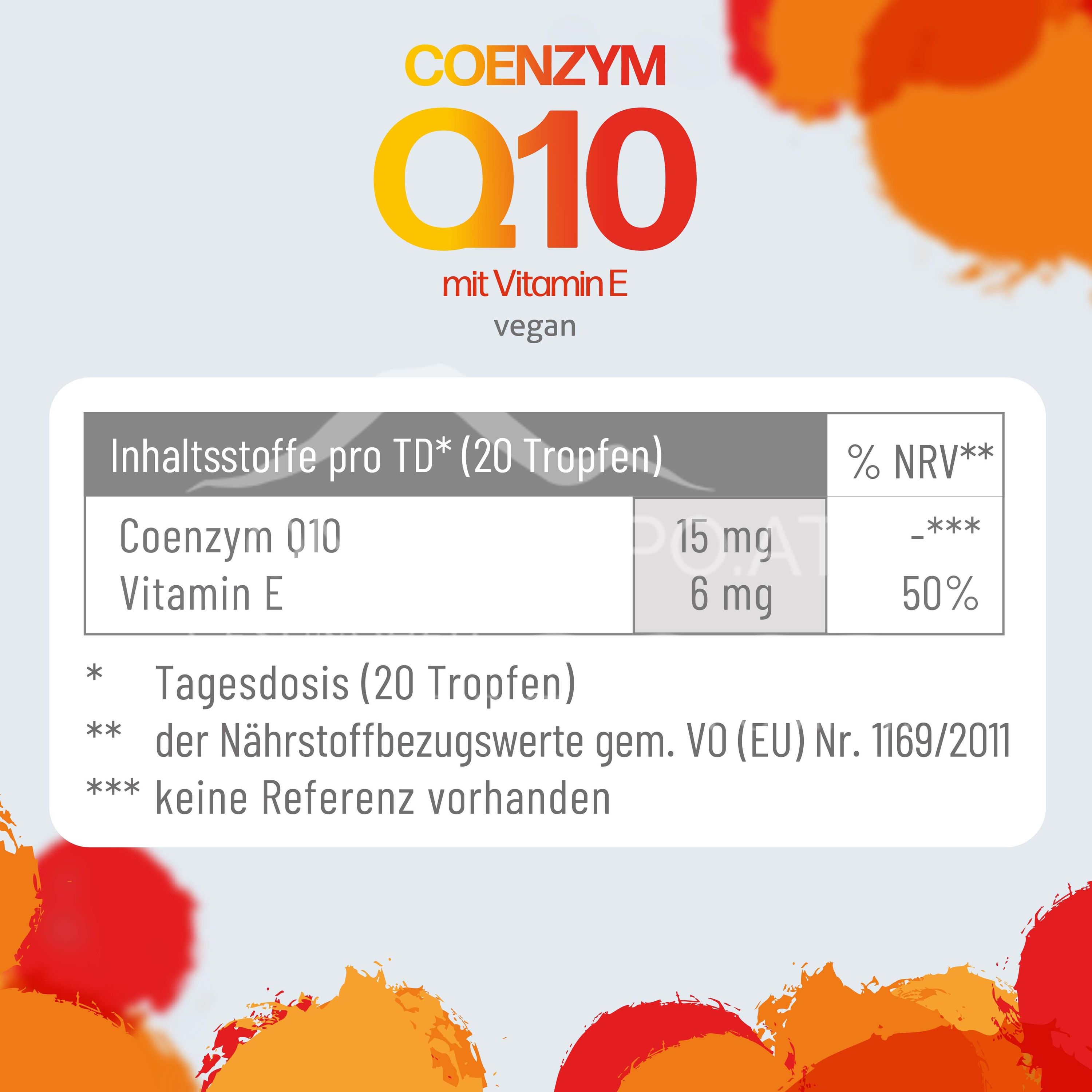 - Zusammensetzung pro Tagesdosis (20 Tropfen) %NRV*: Coenzym Q10 15 mg **, Vitamin E 6 mg 50%. * der Nährstoffbezugswerte gem. EU-Verordnung 1169/2011. ** keine Referenz vorhanden.