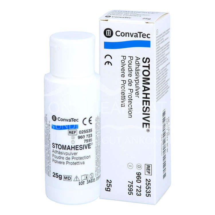 The Stomahesive™ adhesive powder from ConvaTec protects irritated skin by absorbing excess moisture. To do this, lightly dust the affected area with the powder and then blow off the excess material.