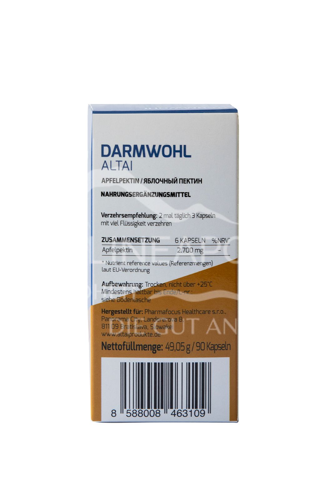 Darmwohl Kapseln Altai ist ein Nahrungsergänzungsmittel mit dem Ballaststoff Pektin. Dieses bindet Wasser und ist daher bei Durchfall geeignet. Außerdem tragen Pektine zur Aufrechterhaltung eines normalen Cholesterinspiegels im Blut bei.