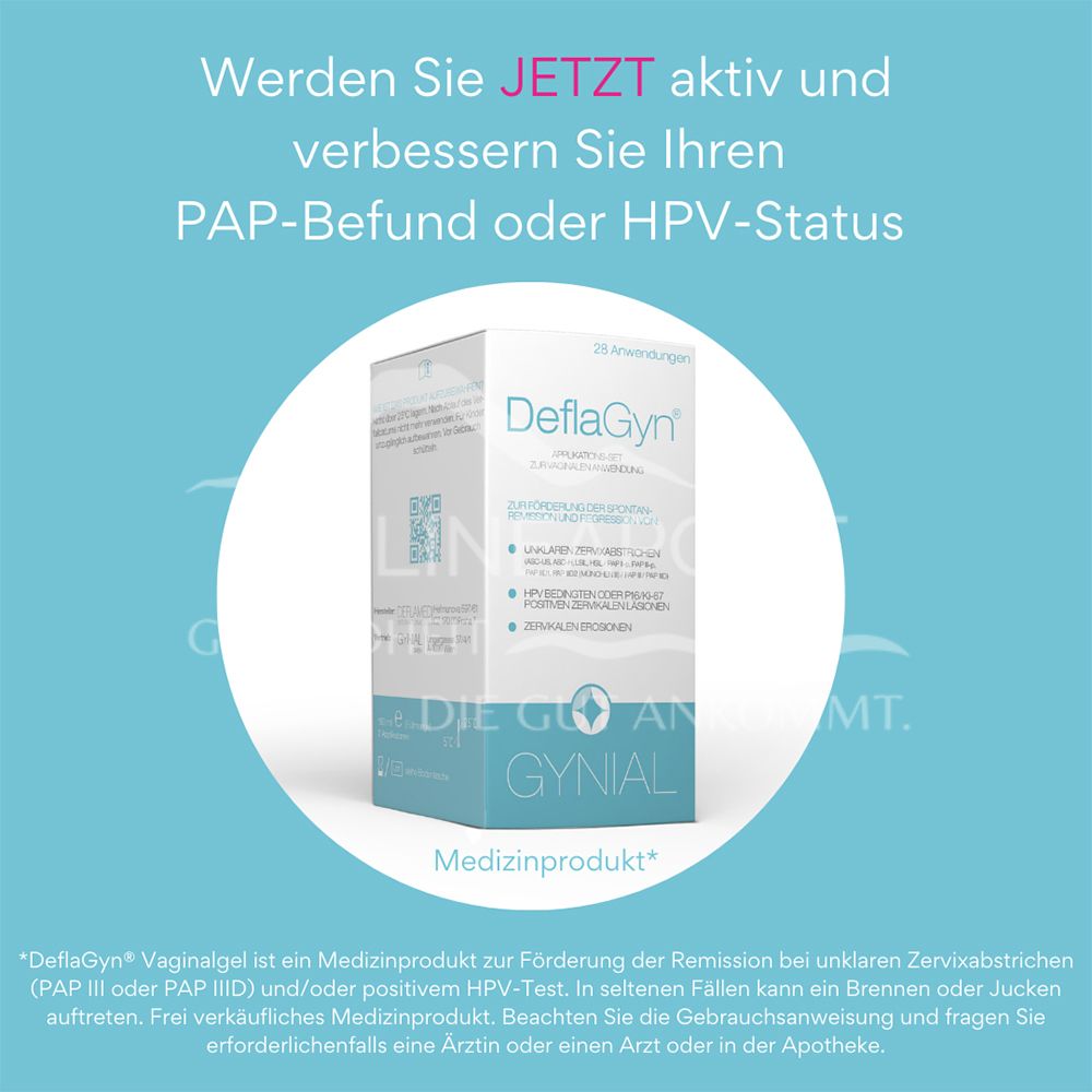 DeflaGyn® vaginal gel is a medical device to promote remission and regression in the case of unclear cervical smears (ASC-US, ASC-H, LSIL, HSIL / PAP II-p, PAP III-p, PAP IIID1, PAP IIID2 (MÜNCHEN III) / PAP III, PAP IIID) or HPV-related or p16/Ki-67 positive cervical lesions or cervical erosions. It was specially developed for use while waiting for the next smear test.