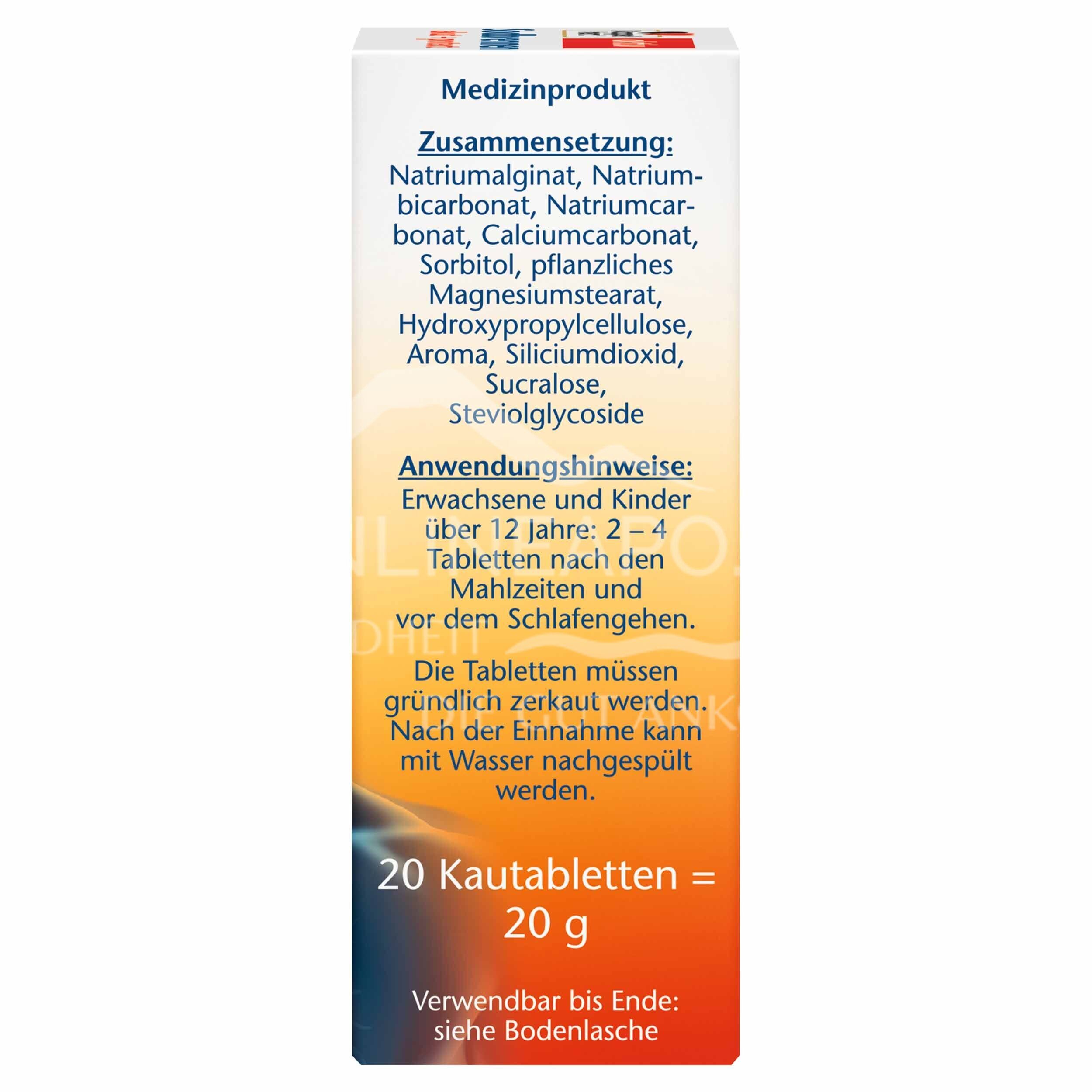 Zusammensetzung: Natriumalginat, Natriumbicarbonat, Natriumcarbonat, Calciumcarbonat, Sorbitol, pflanzliches Magnesiumstearat, Hydroxypropylcellulose, Aroma, Siliciumdioxid, Sucralose, Steviolglycoside.