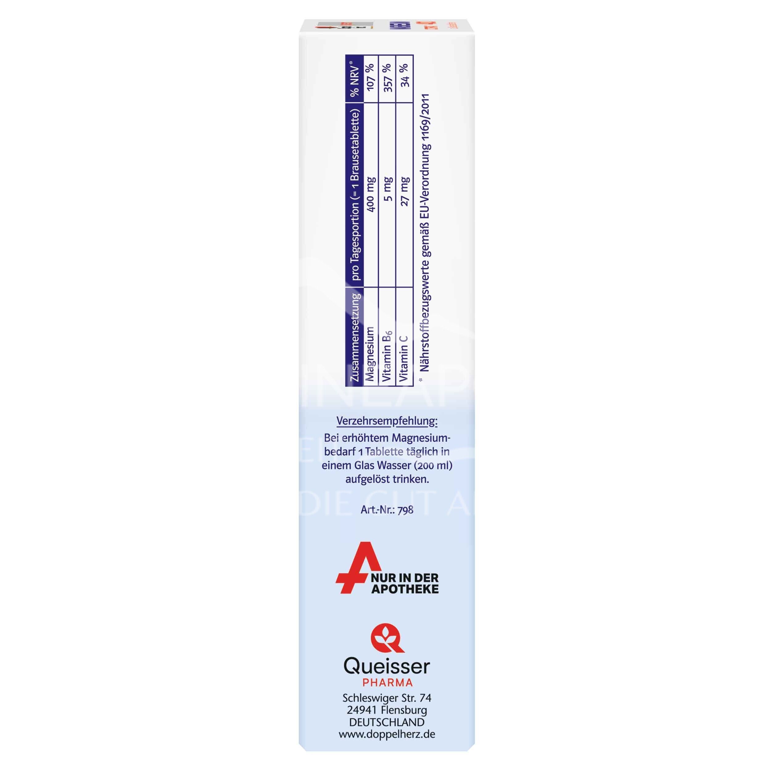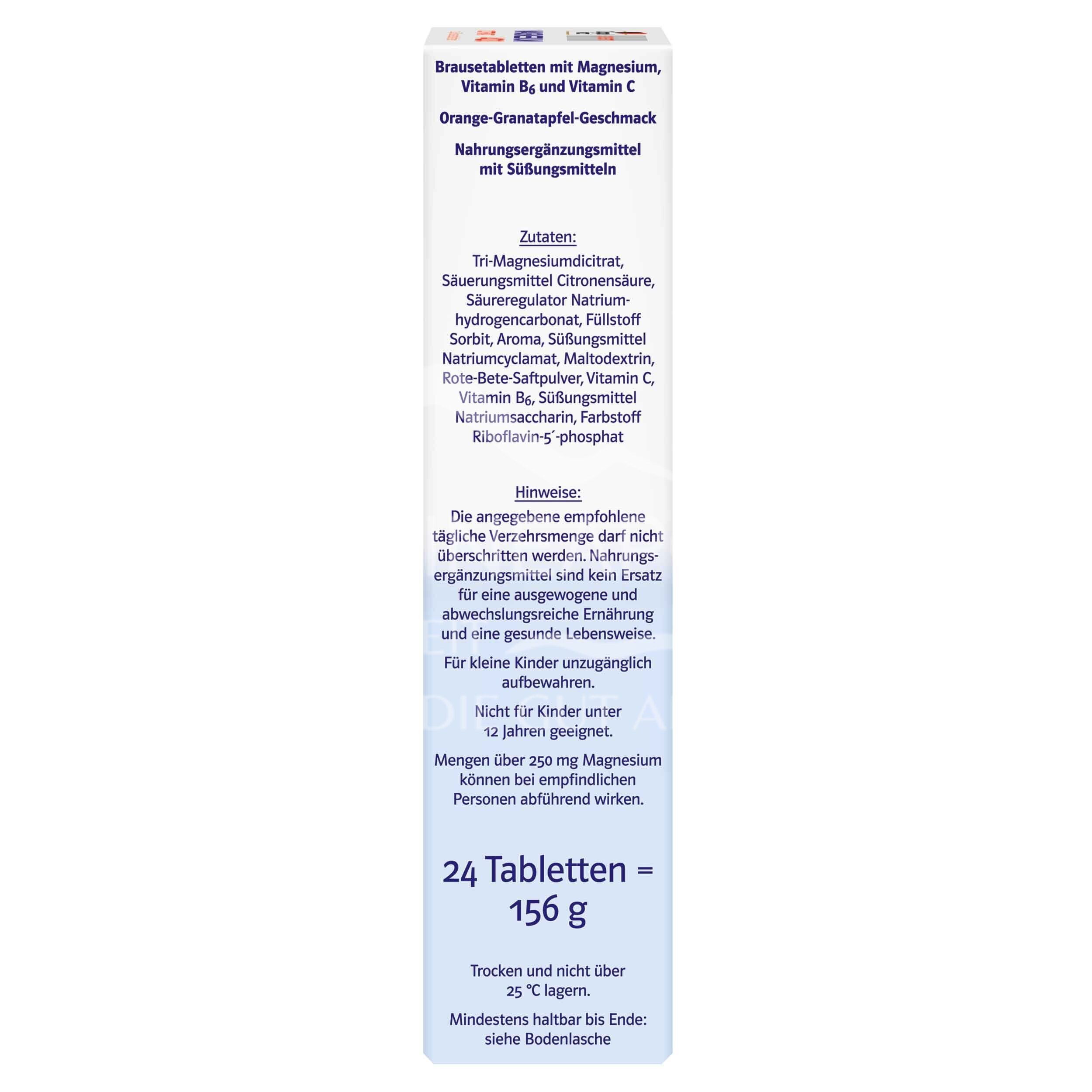 - Zusammensetzung pro Tagesdosis (1 Brausetablette) %NRV*: Magnesium 400 mg 107 %, Vitamin B6 5 mg 357 %, Vitamin C 27 mg 34 %. * Nährstoffbezugswerte gemäß EU-Verordnung 1169/2011.