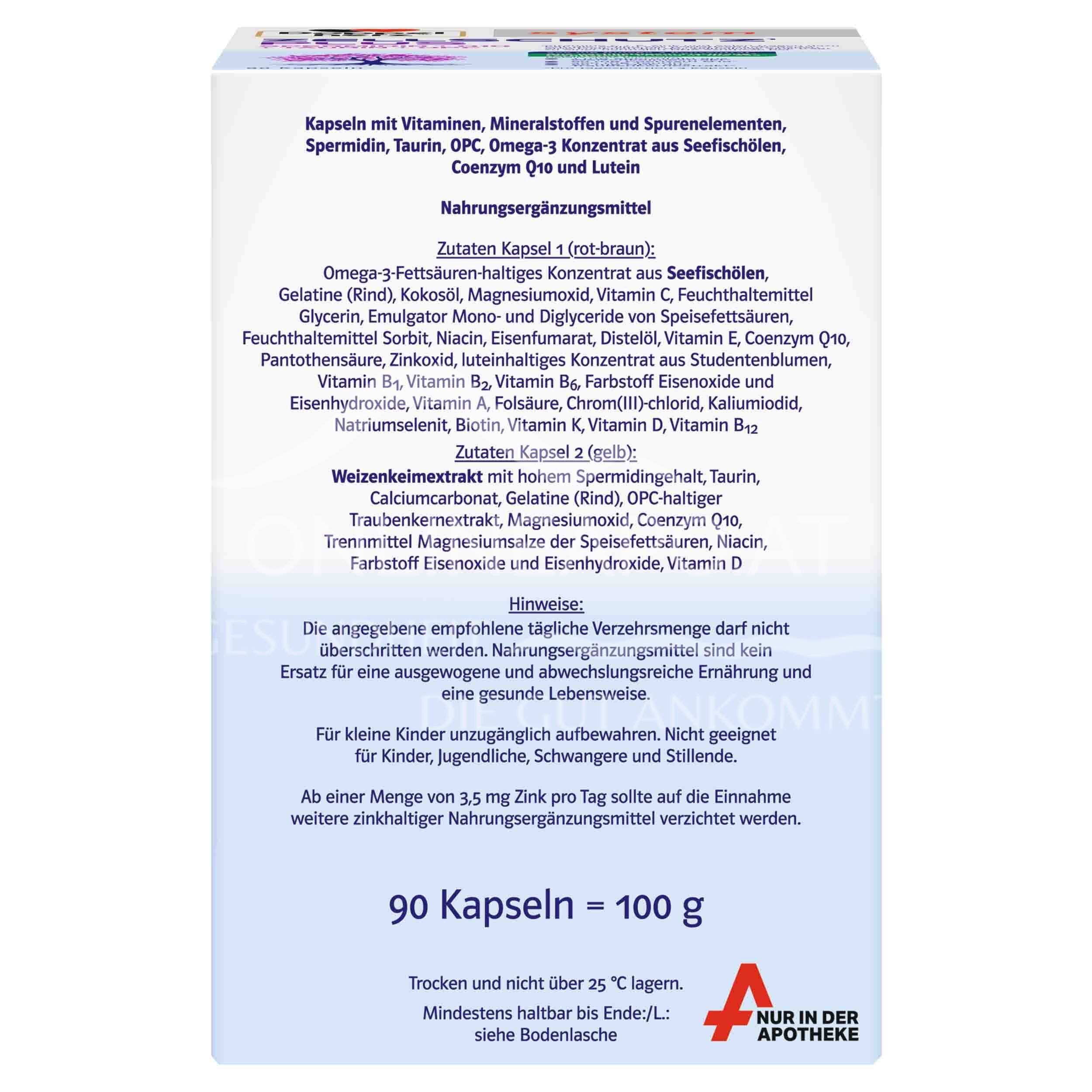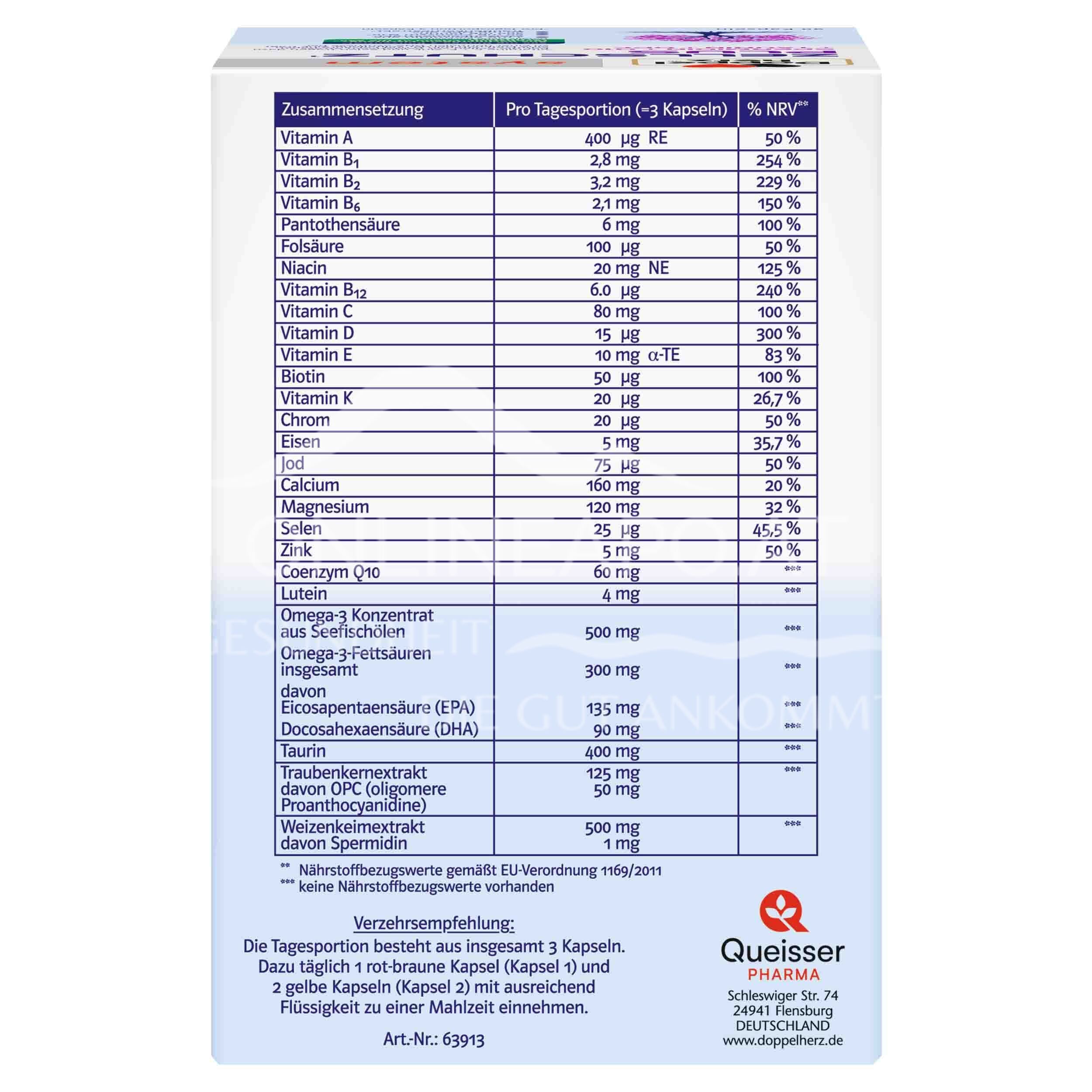 - Zusammensetzung pro Tagesdosis (3 Kapseln %) NRV* Vitamin A 400 µg RE 50 %, Vitamin B1 2,8 mg 254 %, Vitamin B2 3,2 mg 229 %, Vitamin B6 2,1 mg 150 %, Pantothensäure 6 mg 100 %, Folsäure 100 µg 50 %, Niacin 20 mg NE 125 %, Vitamin B12 6 µg 240 %, Vitamin C 80 mg 100 %, Vitamin D 15 µg 300 %, Vitamin E 10 mg α-TE 83 %, Biotin 50 µg 100 %, Vitamin K 20 µg 26 %, Chrom 20 µg 50 %, Eisen 5 mg 35 %, Jod 75 µg 50 %, Calcium 160 mg 20 %, Magnesium 120 mg 32 %, Selen 25 µg 45 %, Zink 5 mg 50 %, Coenzym Q10 60 mg **, Lutein 4 mg **, Omega-3 Konzentrat aus Seefischölen 500 mg **, Omega-3-Fettsäuren insgesamt 300 mg **, Eicosapentaensäure (EPA) 135 mg **, Docosahexaensäure (DHA) 90 mg **, Taurin 400 mg **, Traubenkernextrakt 125 mg ** Davon OPC (Oligomere Proanthocyanidine) 50 mg **, Weizenkeimextrakt 500 mg ** davon Spermidin 1 mg **.* Nährstoffbezugswerte gemäß EU-Verordnung 1169/2011. ** Keine Nährstoffbezugswerte vorhanden.