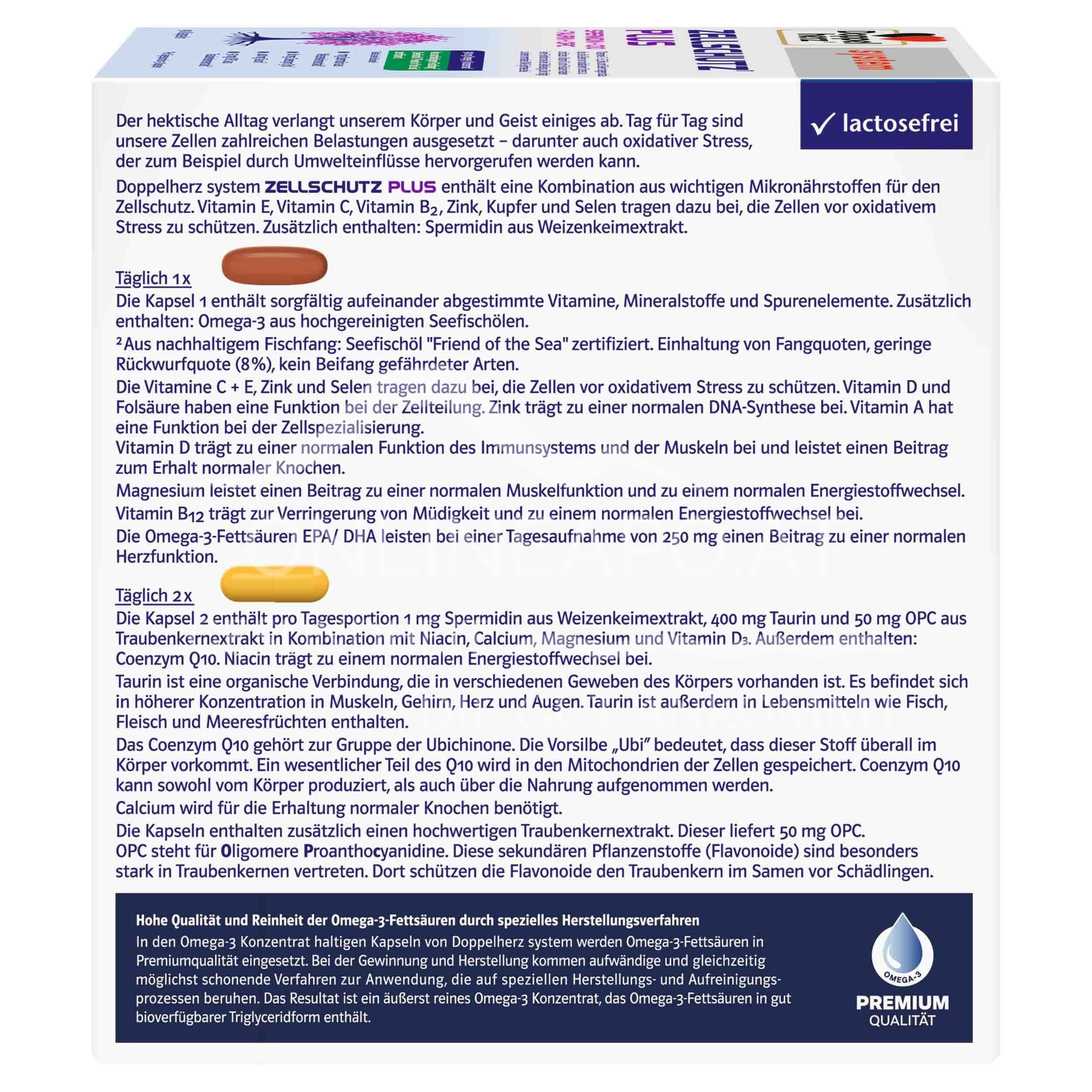 - Zutaten Kapsel 2 (gelb): Weizenkeimextrakt mit hohem Spermidingehalt, Taurin, Calciumcarbonat, Gelatine (Rind), OPC-haltiger Traubenkernextrakt, Magnesiumoxid, Coenzym Q10, Trennmittel Magnesiumsalze der Speisefettsäuren, Niacin, Farbstoff Eisenoxide und Eisenhydroxide, Vitamin D.