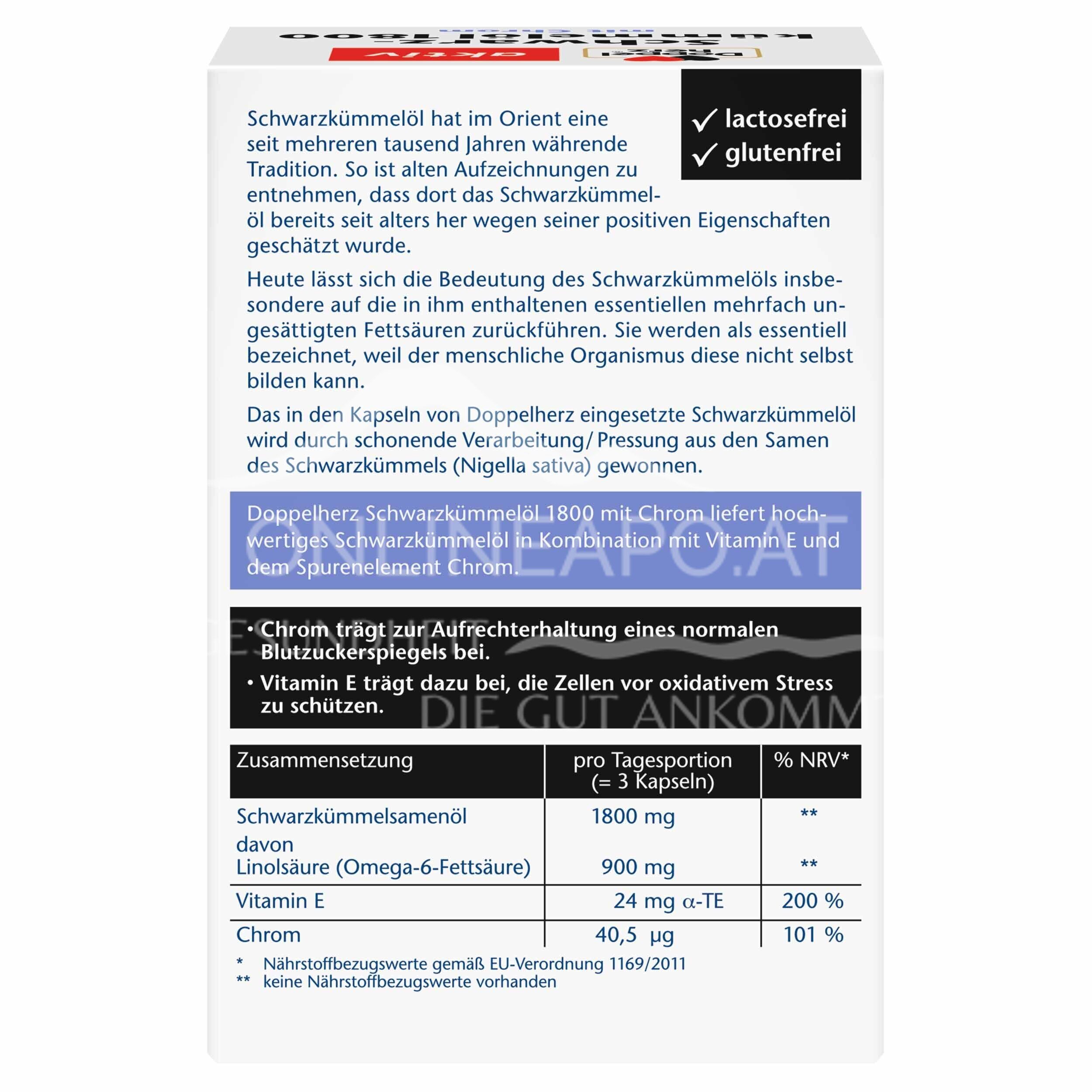 Doppelherz Active Black Cumin Seed Oil 1800 with Chromium Capsules are a dietary supplement with black cumin seed oil, vitamin E and chromium.