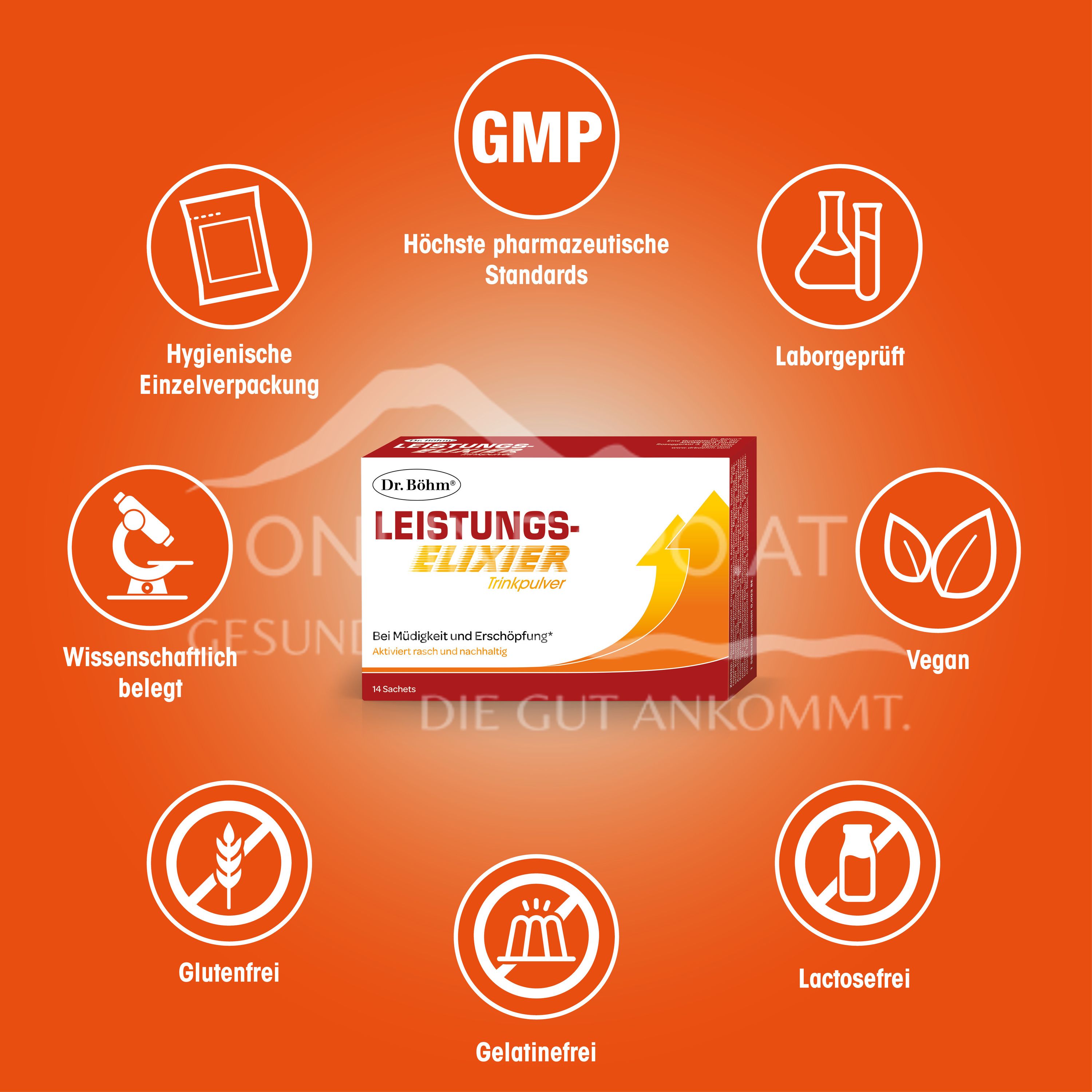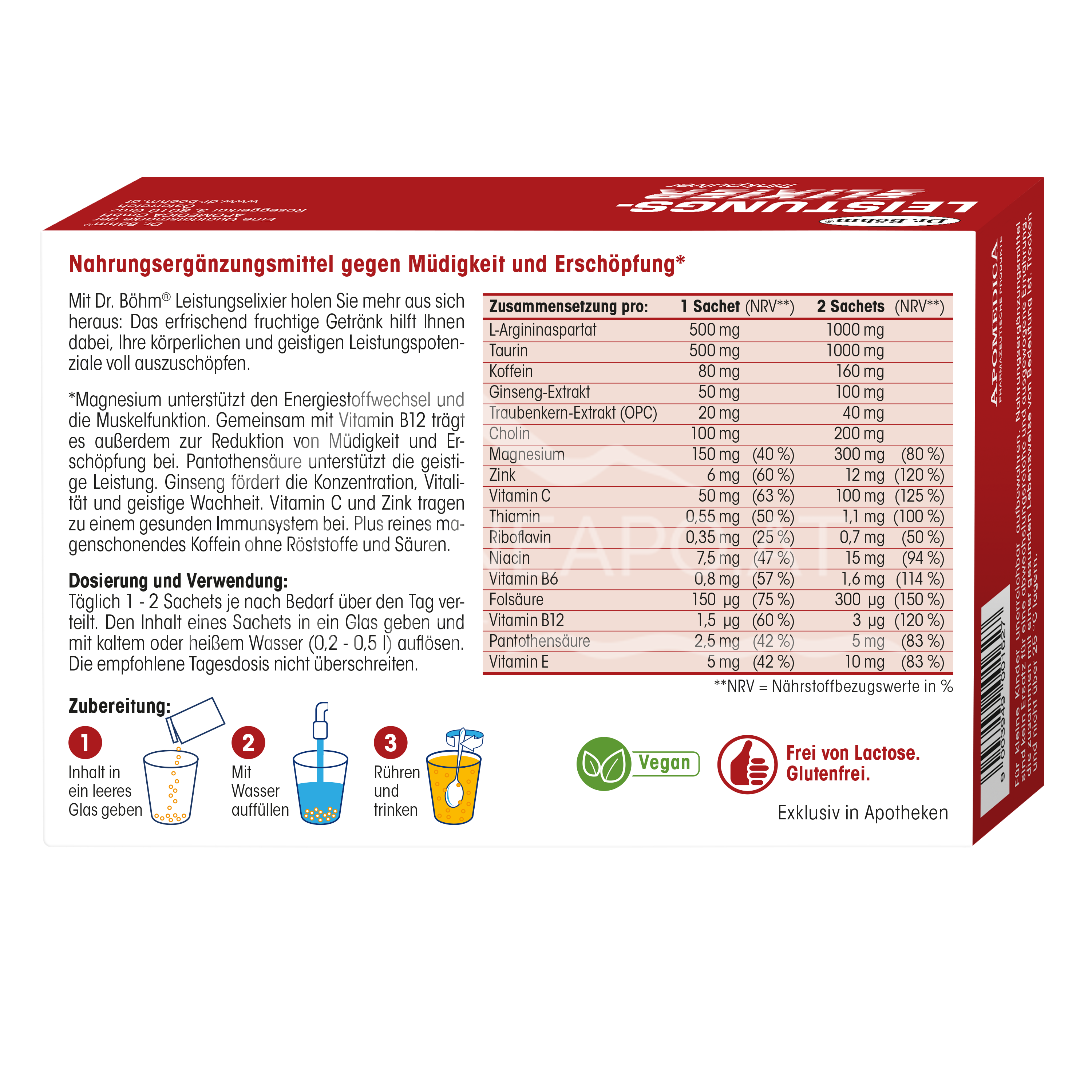 Dr Böhm® Performance Elixir Effervescent Granules is your natural energy booster for concentration and performance. With a unique combination of caffeine, ginseng and B vitamins, it supports you during physical and mental exertion.