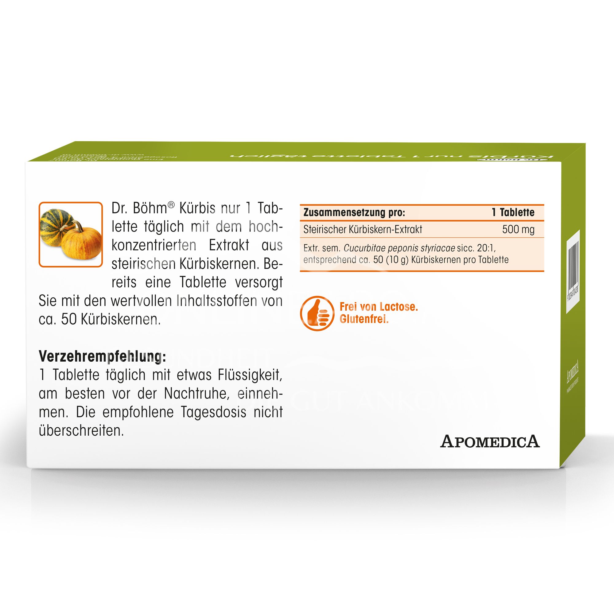 - 1 tablet contains: Extract from Styrian pumpkin seeds 500 mg (Extr. sem. Cucurbitae peponis styriacae sicc. 20:1, corresponding to 10 g pumpkin seeds per tablet).