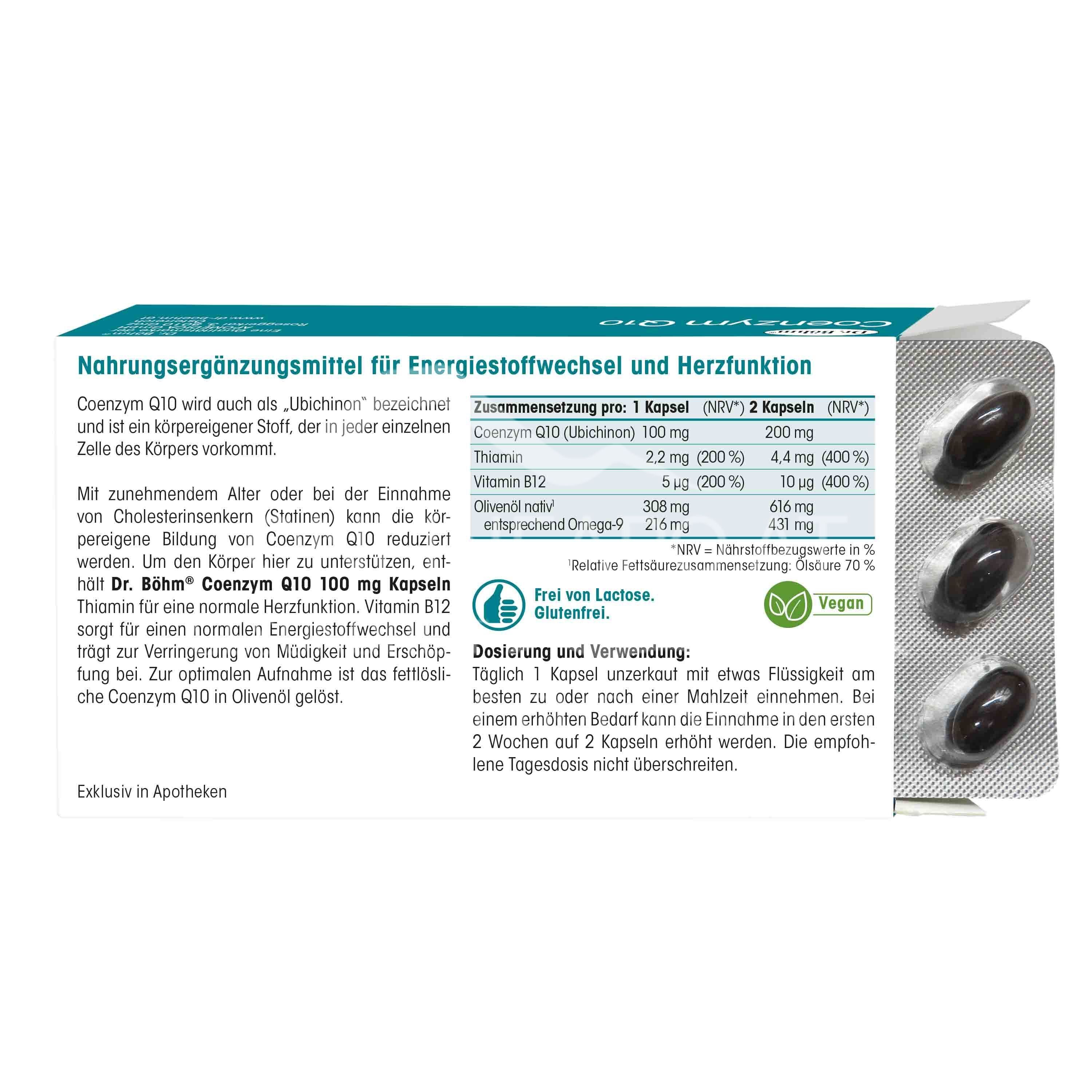Die Dr. Böhm® Coenzym Q10 100 mg Kapseln sind ein Nahrungsergänzungsmittel zur Anwendung bei der Einnahme von Cholesterinsenkern (Statinen) oder mit zunehmendem Alter. Thiamin unterstützt die gesunde Herzfunktion.