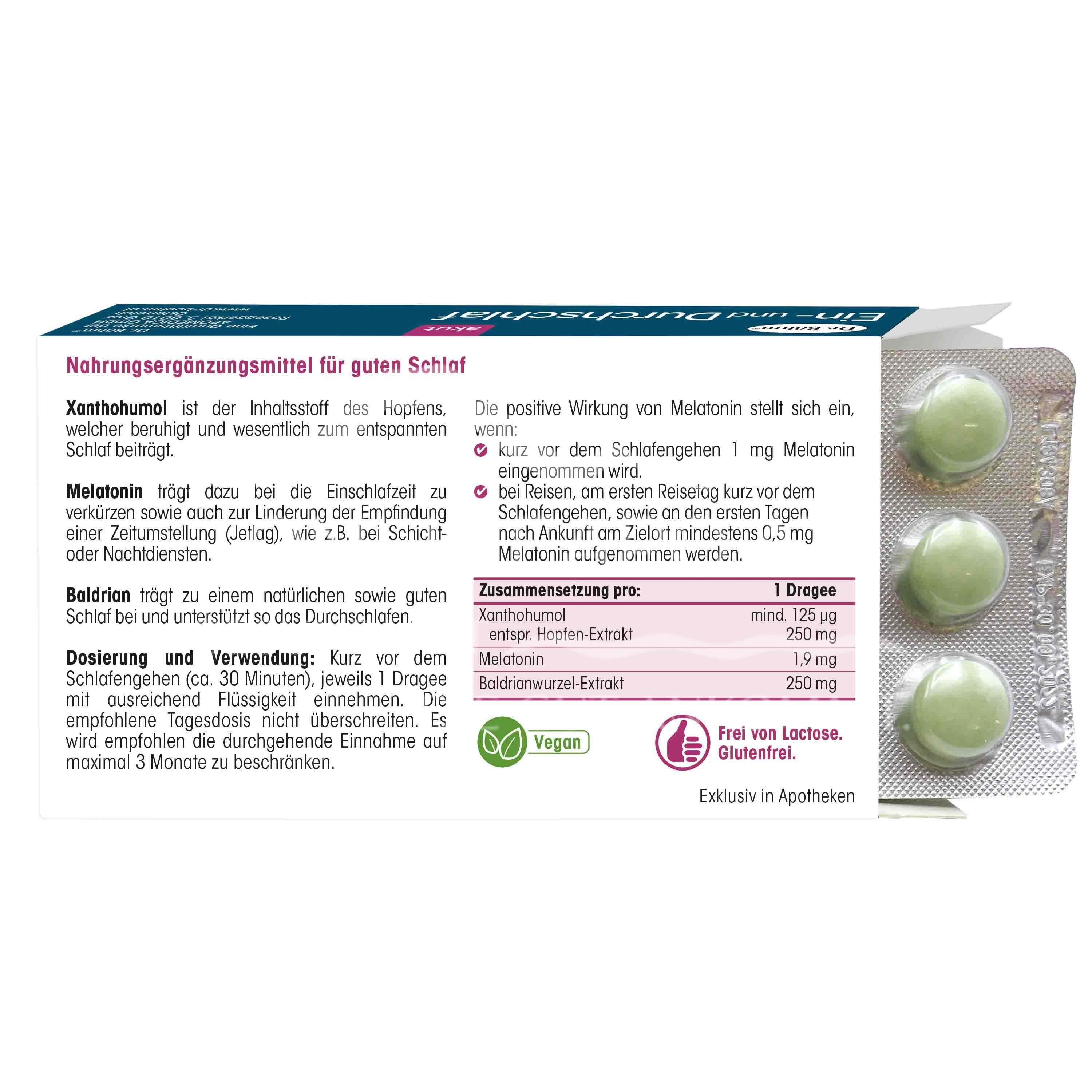 - Zusammensetzung pro Tagesdosis (1 Dragee): Xanthohumol mind. 125 µg entspr. Hopfen-Extrakt 250 mg, Melatonin 1,9 mg, Baldrianwurzel-Extrakt 250 mg.