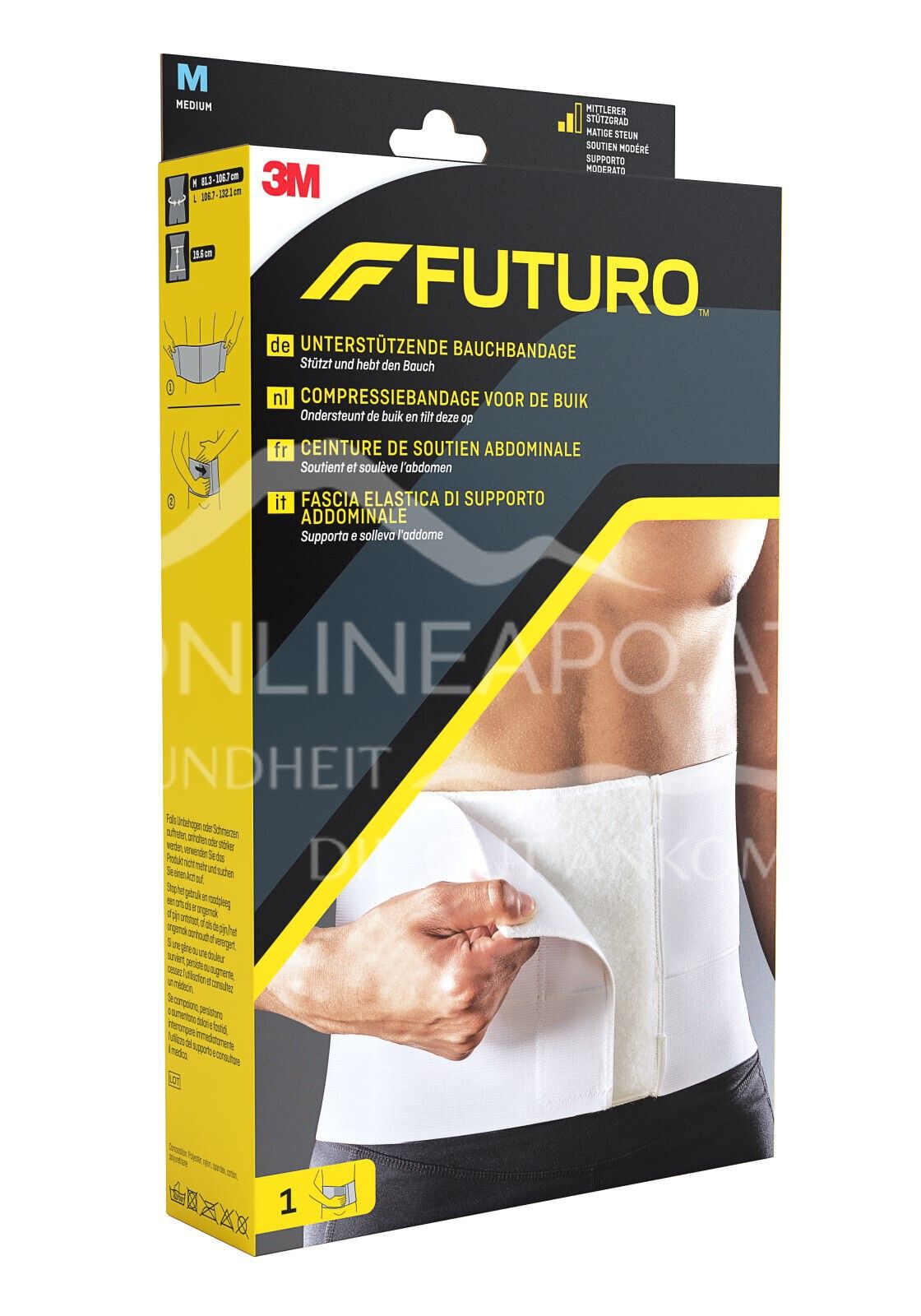 - Open the bandage and spread it out on the bed so that the fluffy side is on top and the FUTURO lettering is on the other side. Lie down and position the support under your back. Grasp the wide pad and pull it over the abdomen or wound dressing.
