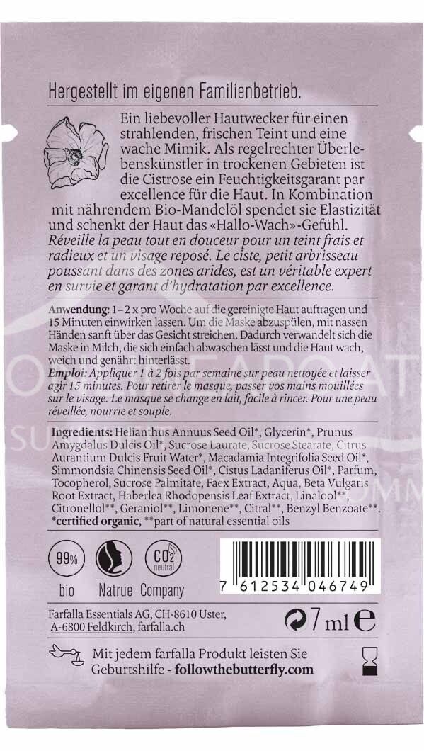 The Farfalla Cistrose Mask revitalises and nourishes your skin. For a fresh, revitalised complexion. Natural anti-ageing care with organic cistus. The Farfalla SOS Mask is effective against tired skin.