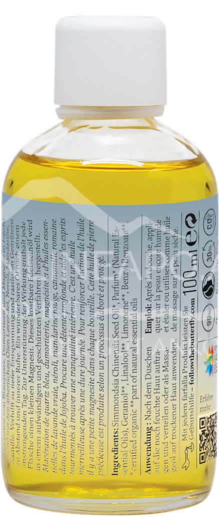 Maceration of blue quartz, dumortierite and magnesite in jojoba oil and with the essential oils lavender, neroli, mandarin and camomile. Helps deep relaxation and restless minds to find distance and inner peace. A wonderful oil after a stressful day. To support the effect, each bottle contains a small magnesite. This precious gemstone oil is produced in an elaborate and protected process