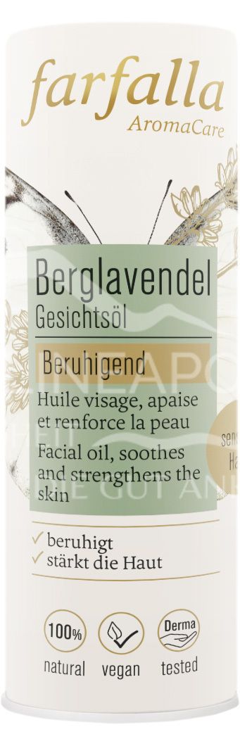 Der Berglavendel stammt aus einem farfalla Bio- und Grand Cru-Projekt aus Südfrankreich – dem ältesten Projekt von farfalla. Er wird von Juli bis August von zehn Sammlerinnen in den Hochebenen der Cevennen (les Causses), dem südöstlichen Teils des Zentralmassivs, gesammelt. Der Berglavendel ist genetisch einzigartig und kommt in dieser Unterart nur in den Cevennen vor. Er wird geschätzt für seine hautberuhigende Wirkung, die gründlich erforscht ist. Wirkstoff-Komponenten: Bio-Johanniskrautöl, Bio-Nachtkerzenöl, Bio-Jojobaöl, Bio-Mandelöl; ätherische Öle von Bio-Wilder Berglavendel, Bio-Rosengeranie, Bio-Palmarosa, Bio-Melisse, Neroli u.a.