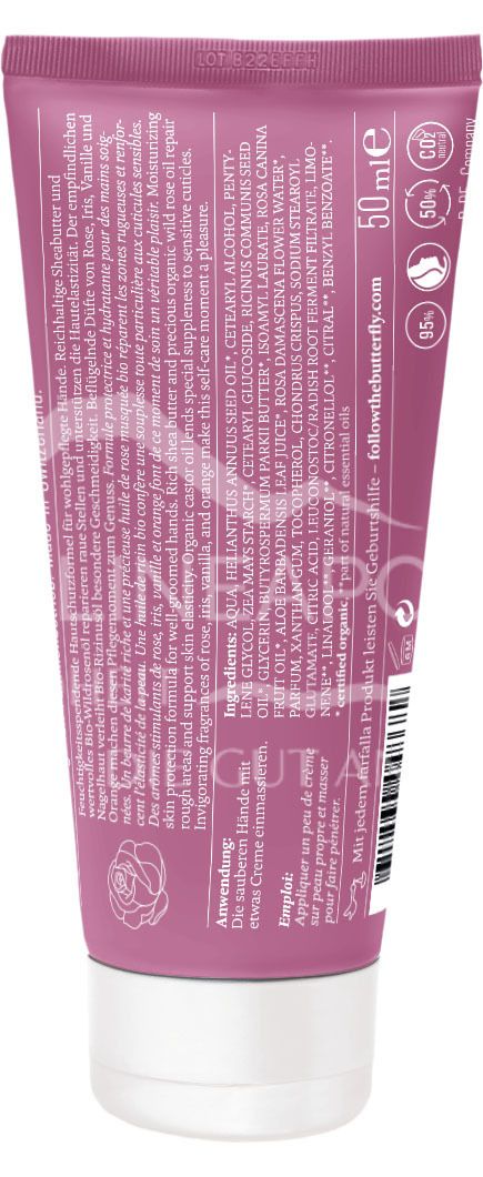 Moisturising skin protection formula for well-cared for hands. Rich shea butter and valuable organic wild rose oil repair rough patches and support skin elasticity. Organic castor oil gives the sensitive cuticles special suppleness. Inspiring fragrances of rose, iris, vanilla and orange make this moment of care a pleasure