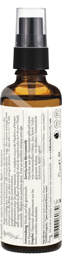 The hydrolate of immortelle is highly regenerating and skin-rejuvenating, and it is no coincidence that it is nicknamed "the immortal". The warm, spicy fragrance of the organic immortelle hydrolate is reminiscent of the immortelle blossom, but is much more subtle than the essential oil. In natural cosmetics, it is considered a collagen booster and is an excellent fountain of youth for facial skin