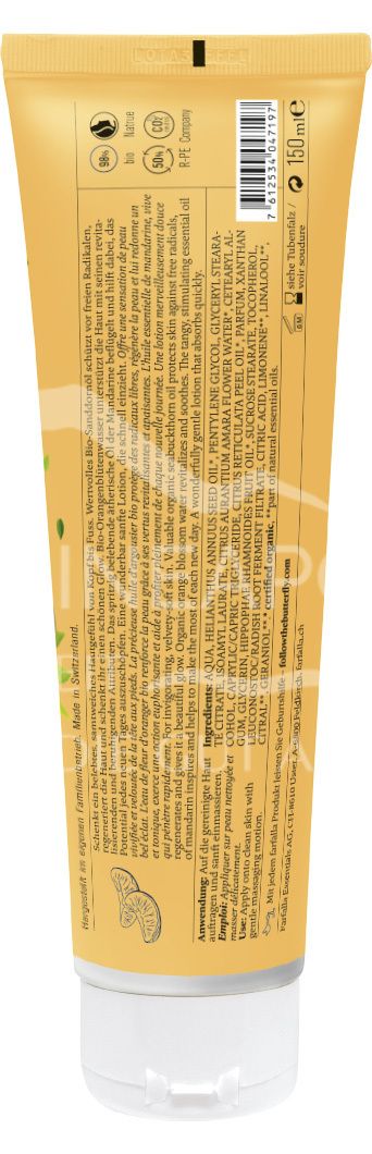 Leaves your skin feeling revitalised and velvety soft from head to toe. Valuable organic sea buckthorn oil protects against free radicals, regenerates the skin and gives it a beautiful glow. Organic orange blossom water supports the skin with its revitalising and soothing attributes. The tangy, invigorating essential oil of mandarin inspires and helps to realise the potential of each new day. New formula: a wonderfully gentle lotion that spreads easily and is absorbed very quickly. Application test: Up to 20% increased skin hydration 24h after application. *clinically tested