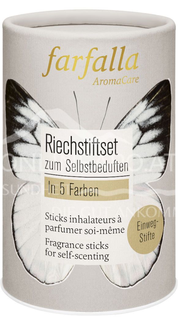 Discover the practical Farfalla fragrance stick set with 5 invigorating colours. Ideal for aromatherapy on the go. For self-filling with essential oils for dry inhalation.