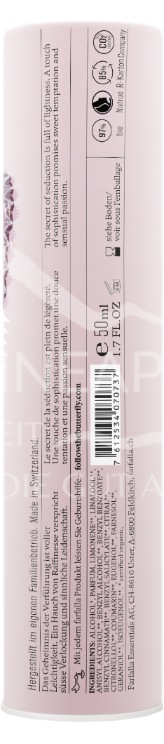The secret of seduction is full of lightness. A touch of sophistication promises sweet temptation and sensual passion. With essential oils of bergamot, neroli, lemon balm, tuberose, benzoin and others