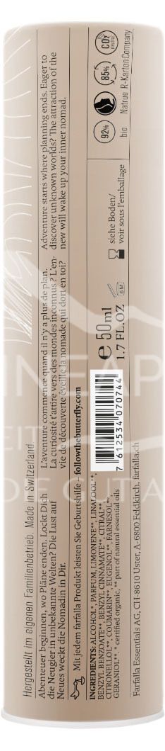 Unleash your inner nomad! Eau de Parfum nomad by Farfalla is a woody-fresh fragrance made from pure essential oils. Experience freedom with mandarin, iris and vetiver. 100% natural, vegan and NaTrue certified organic cosmetics