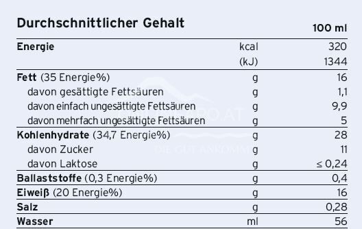 Wasser, Glukosesirup, Rapsöl, Kollagenhydrolysat, Zucker, Milcheiweiß, Maltodextrin, Stabilisatoren (E 460, E 466), Aromen, Emulgatoren (E 471, Sojalecithine, E 472e), Calciumphosphat, Kaliumchlorid, Säureregulatoren (E 524, E 525), Kaliumhydrogenphosphat, Kaliumcitrat, Vitamin C, Calciumcitrat, Magnesiumchlorid, Magnesiumoxid, Eisenpyrophosphat, Natriumchlorid, Zinksulfat, Niacin, Manganchlorid, Vitamin E, Pantothensäure, Kupfersulfat, Natriumfluorid, Vitamin B2, Vitamin B6, Vitamin B1, Beta-Carotin, Vitamin A, Chromchlorid, Folsäure, Natriummolybdat, Kaliumjodid, Natriumselenit, Vitamin K1, Biotin, Vitamin D3, Vitamin B12.