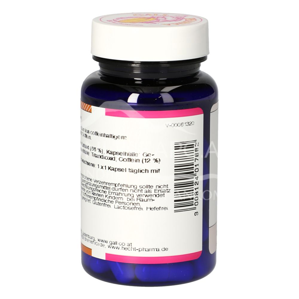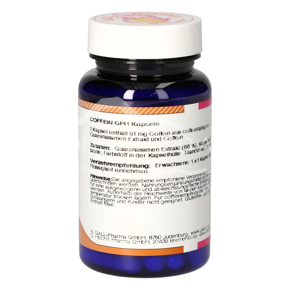 Gall Pharma Caffeine Capsules are a food supplement containing 91 mg caffeine from caffeine-containing guarana seed extract and caffeine per capsule.