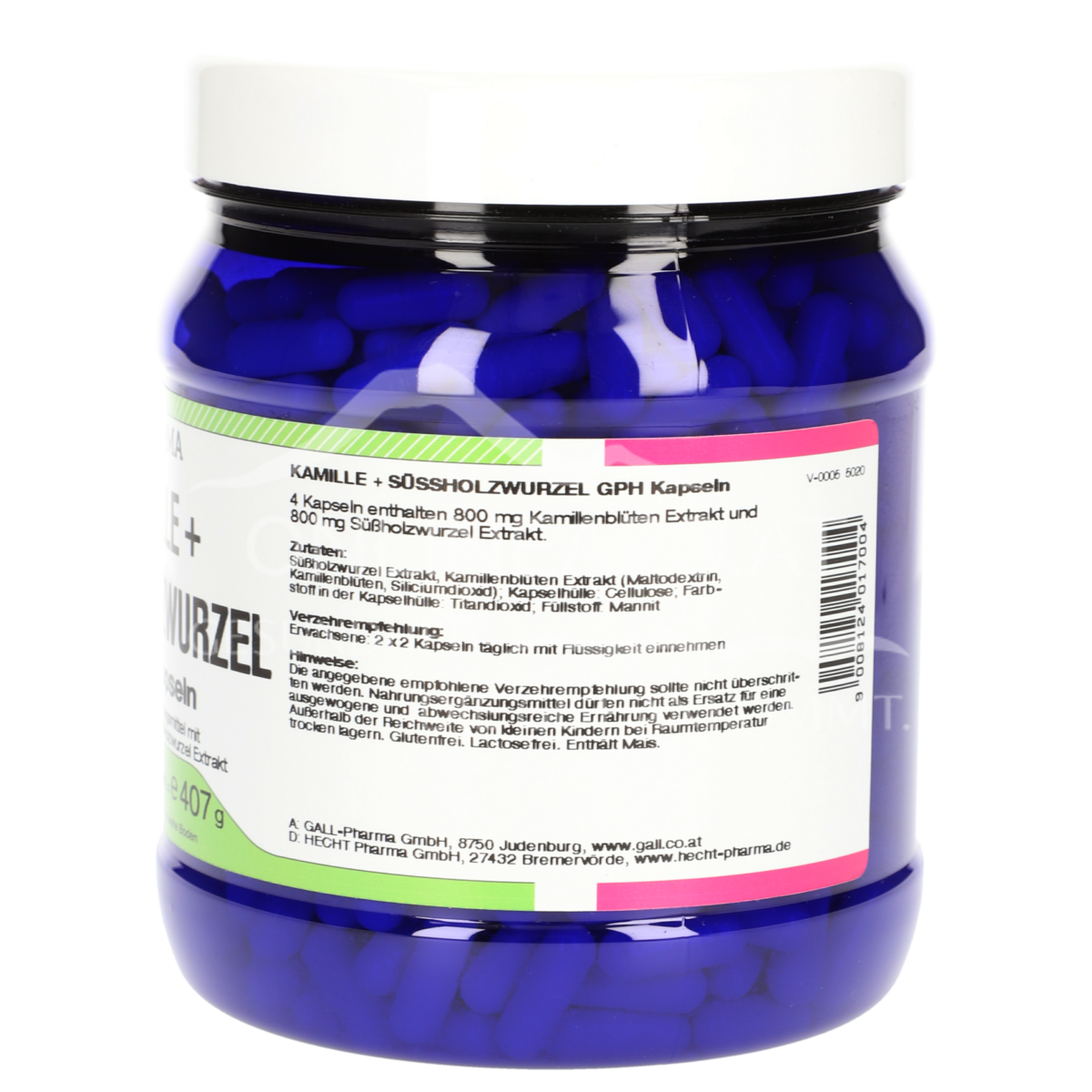 Gall Pharma Camomile + Liquorice Root Capsules are a food supplement containing 200 mg of a 3-4:1 dry extract of liquorice root and 200 mg of a 4:1 dry extract of camomile flowers per capsule.