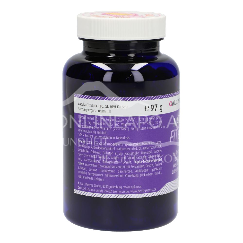 Gall Pharma Macula Fit Stark capsules are a dietary supplement with carrot powder, lutein, vitamin C, ginkgo leaf extract, vitamin E, zeaxanthin, folic acid and selenium to support normal vision.